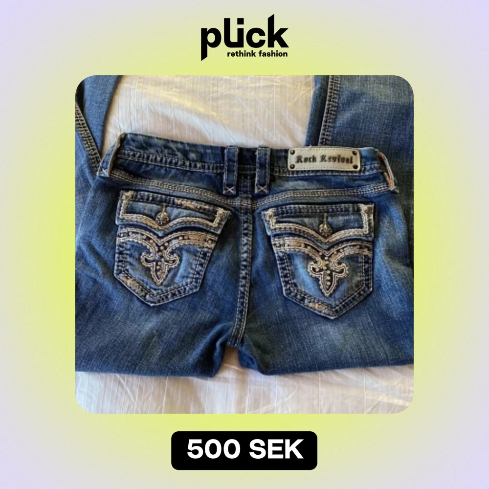 Fetaste Rock Revival jeansen med flera olika knappar, nitar och stenar. Jeans är i strl 29, lågmidjade och omsydda bootcut(se bild). Priset kan diskuteras💋