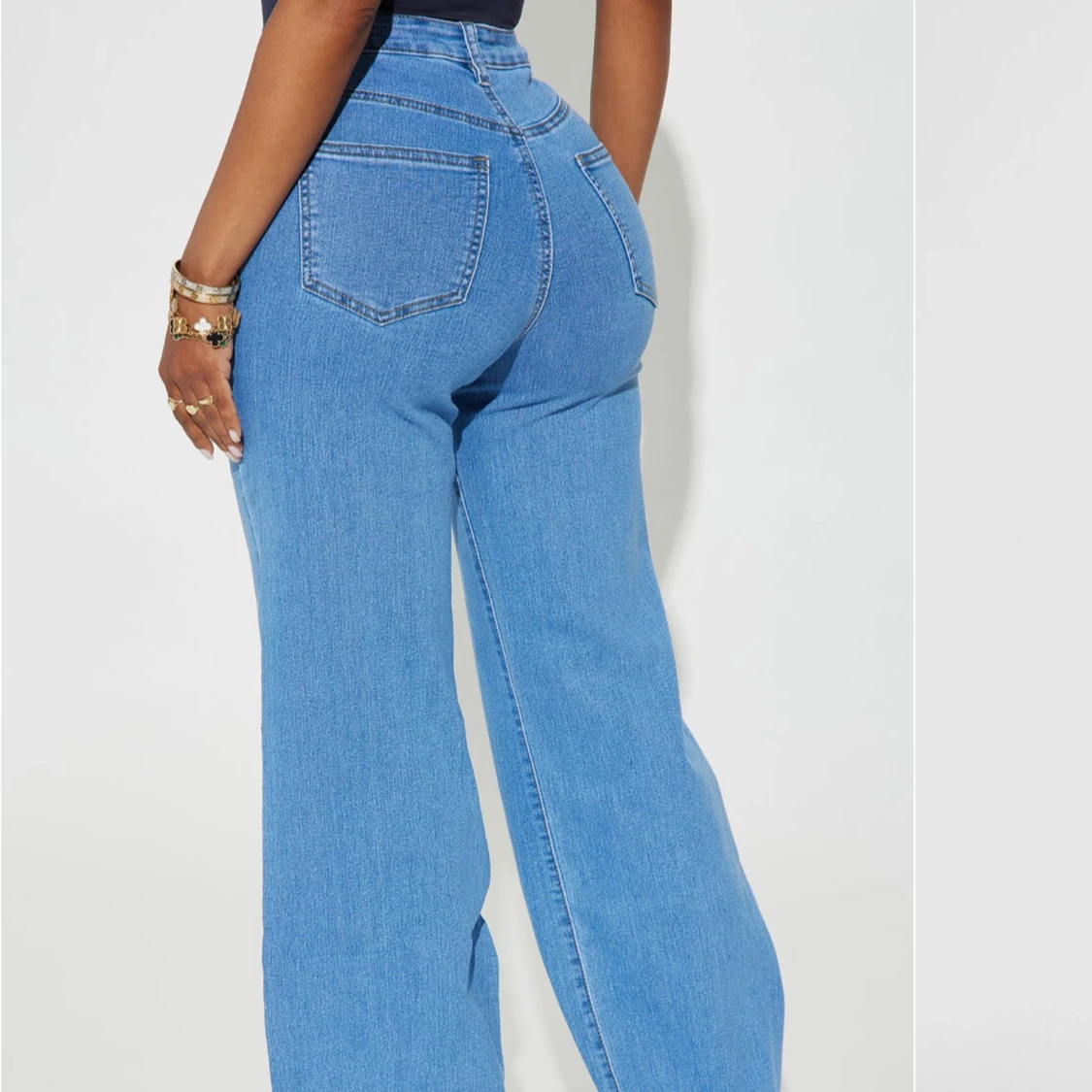 Snygga ljusblå jeans med hög midja och breda ben. Klassisk femficksmodell i stretchigt denim som sitter bekvämt och ger en clean look. Dessa är HELT nya!! Beställde fel storlek så kan inte använda dem och kan inte heller skicka tillbaka då de har stängt tulle till usa.