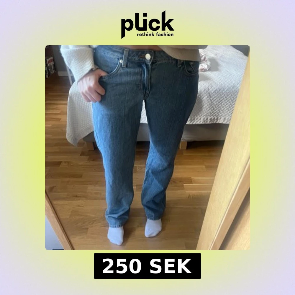 Säljer ett par blå Weekday Arrow Low Straight Jeans med låg midja och raka ben. Klassisk femficksmodell i jeansmaterial, perfekt för dig som gillar en avslappnad och tidlös look. Färgen är mellanblå denim och passformen är rak och normal.