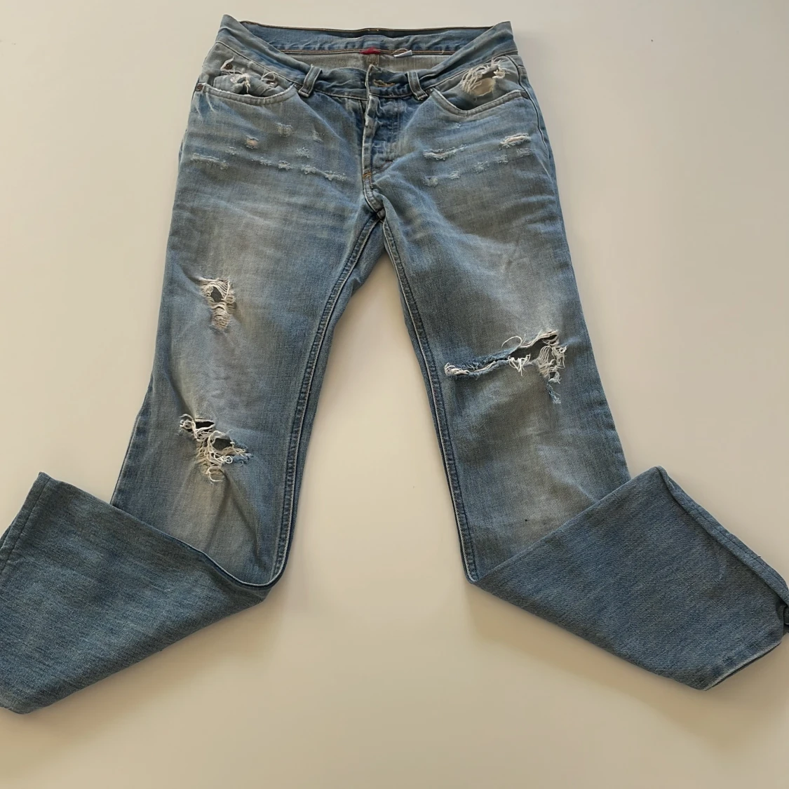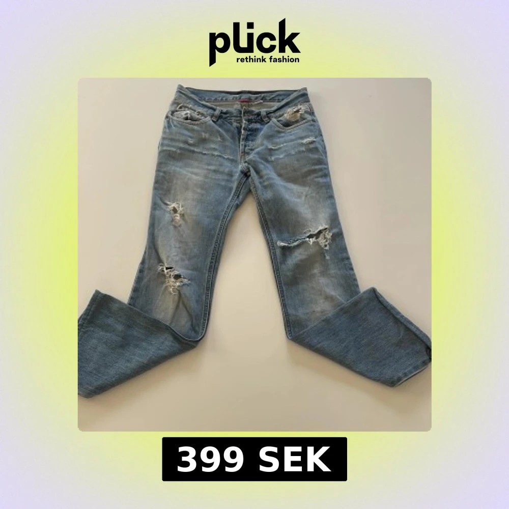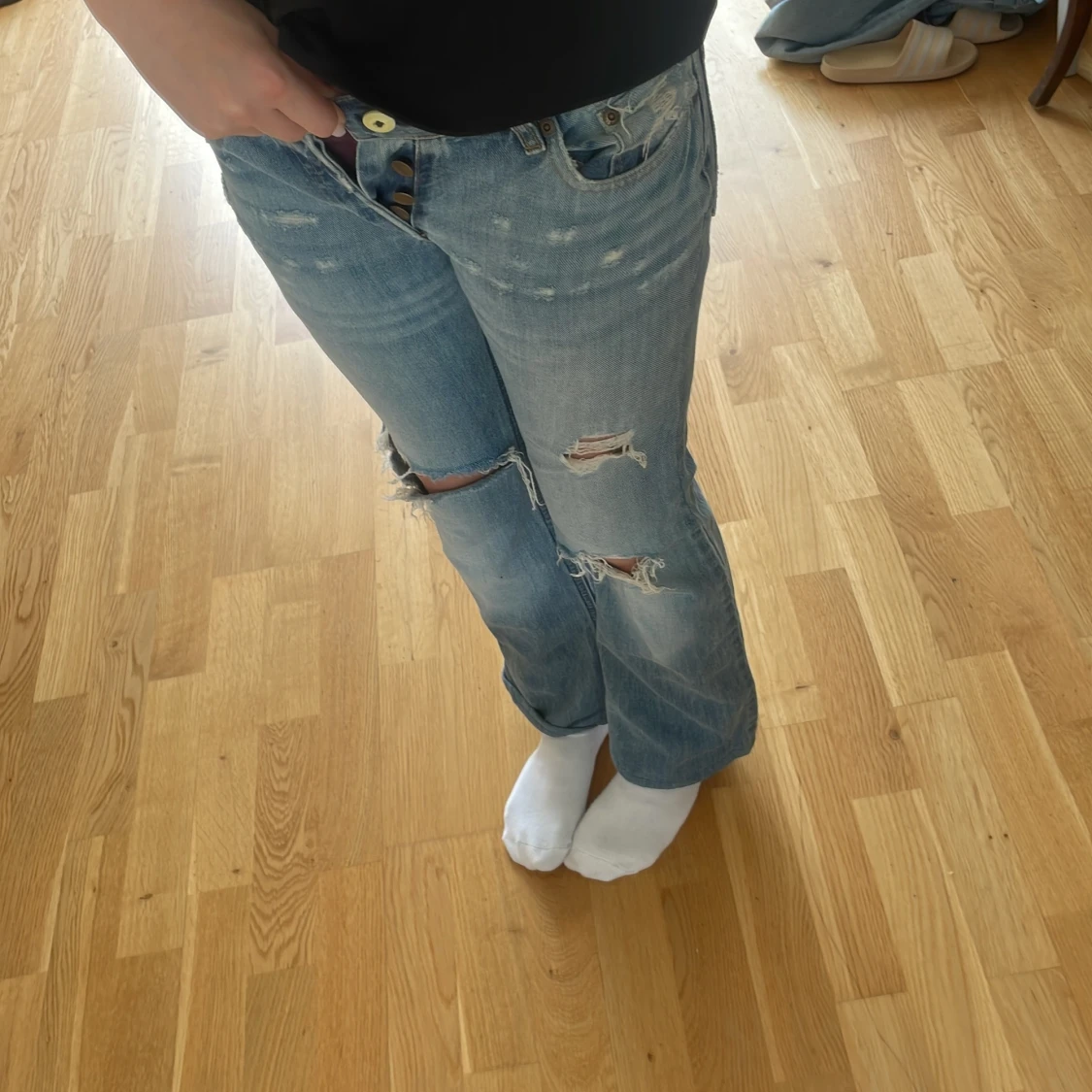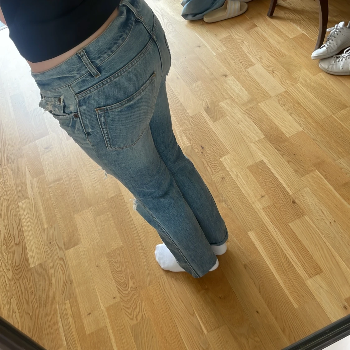 Säljer ett par ljusblå jeans med bootcut passform och snygga slitningar och hål på benen. Jeansen har klassisk femficksdesign, låg midja och är tillverkade i mjukt denim. Perfekta för dig som gillar en avslappnad och trendig look.