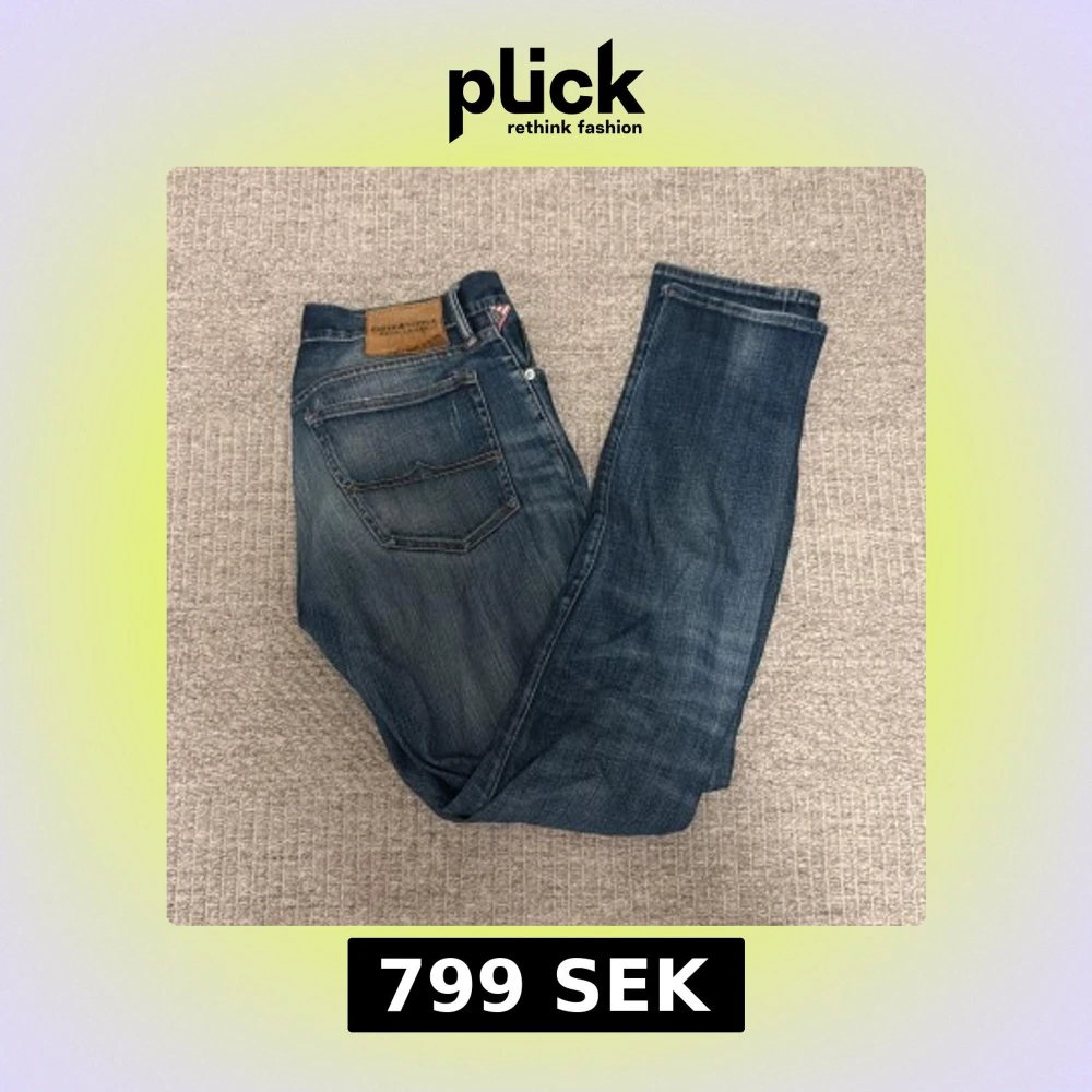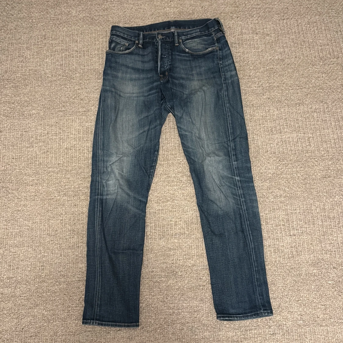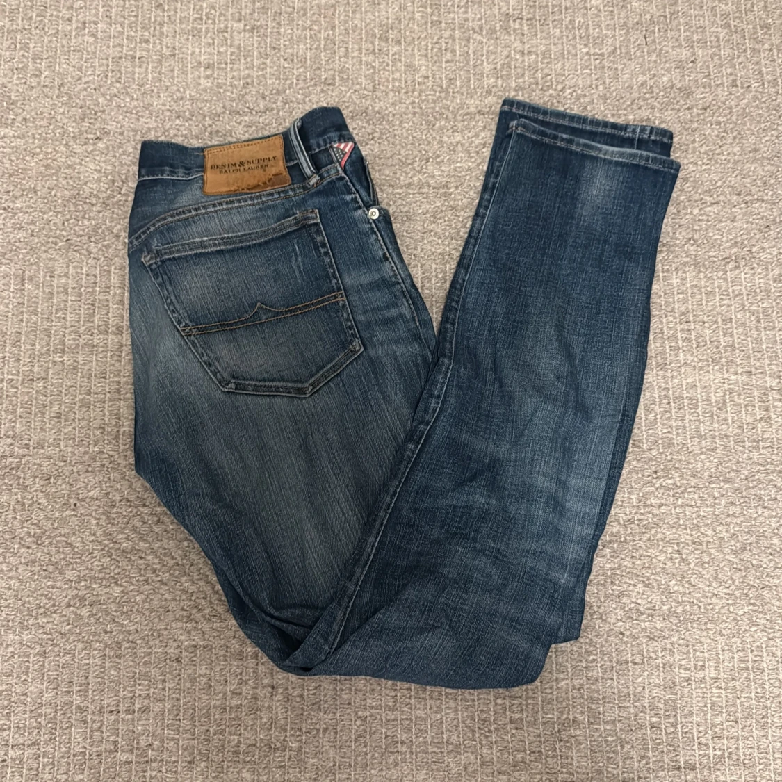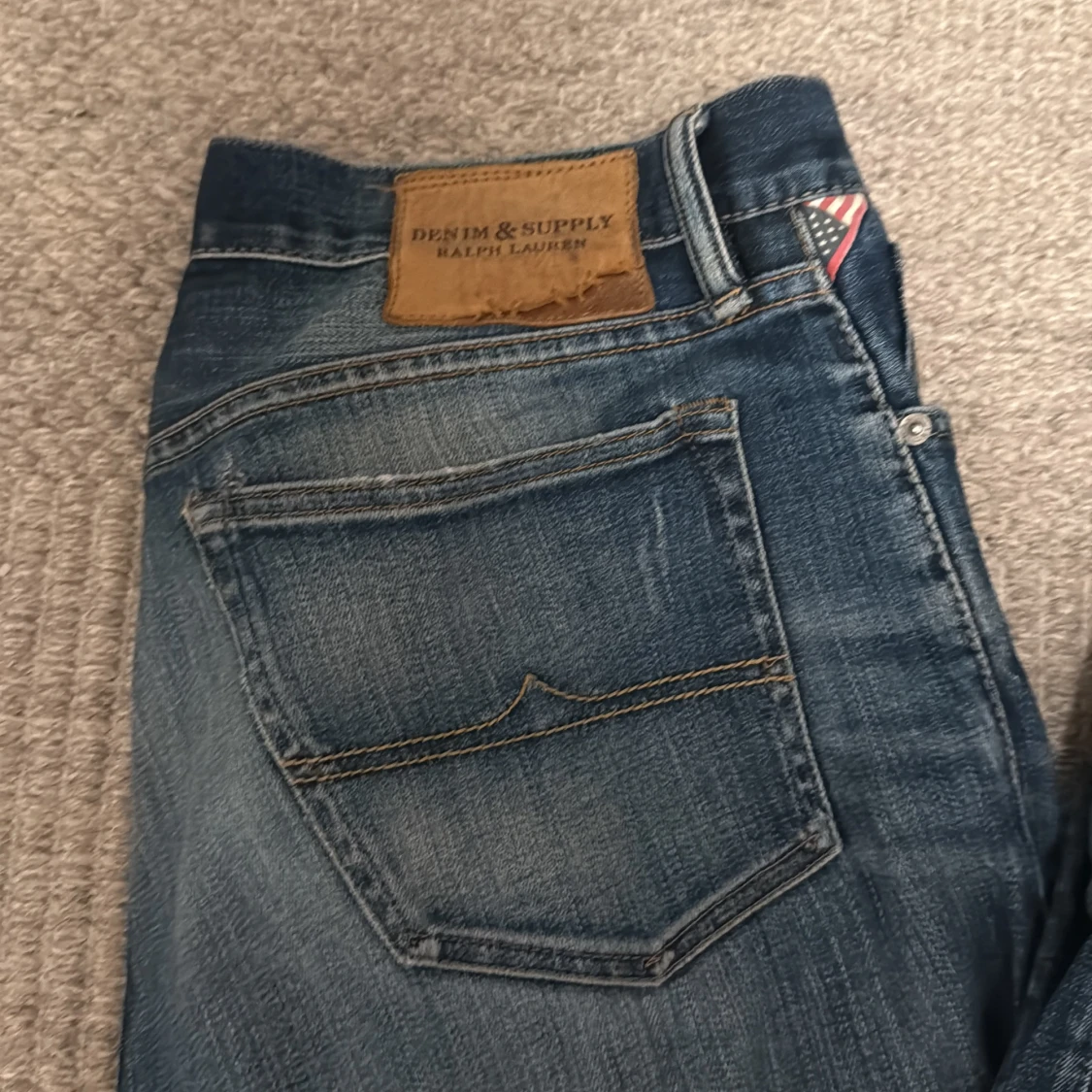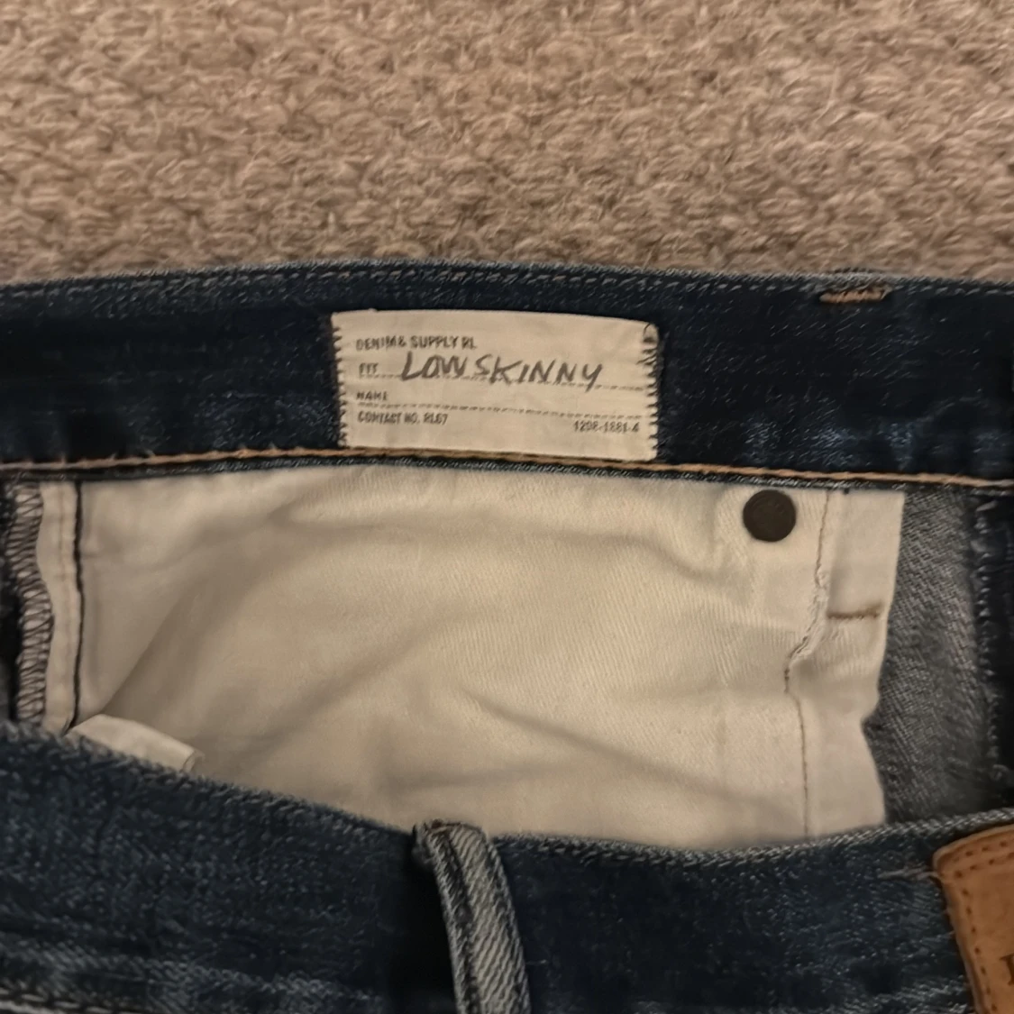 Säljer ett par blå Denim & Supply Ralph Lauren jeans i modellen Low Skinny. Jeansen har klassisk femficksdesign, snygga slitningar och smal passform. Tillverkade i bomull med en schysst tvättad look och läderpatch bak i midjan.