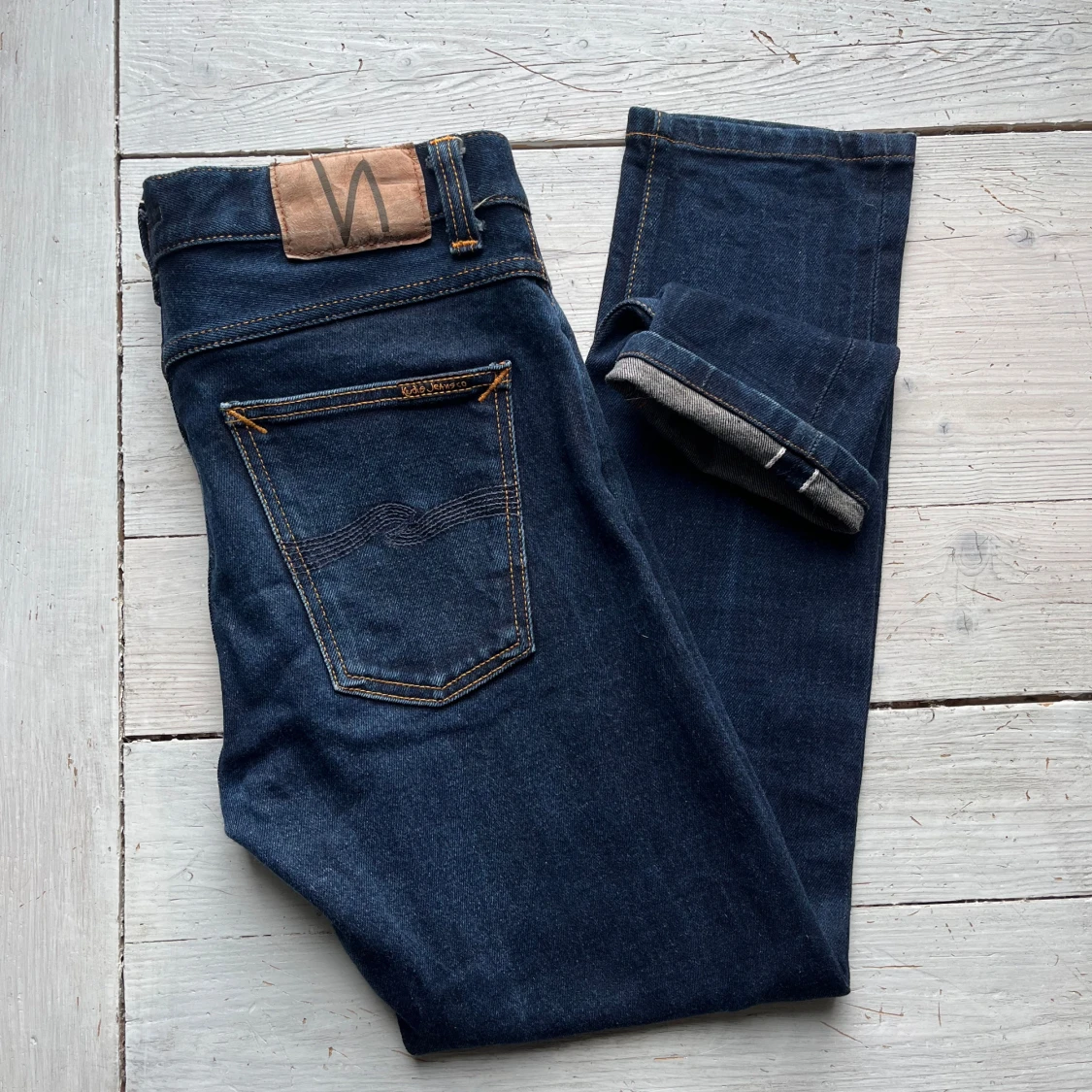 Ett par sjukt feta selvedge nudies i modellen ”Lean Dean” skick 9/10 utan någon deffekt Storlek 31/34 men sitter som 30/31! Selvedge är ett unikt material som gör att de får sjukt feta slitningar efter användning! Nypris cirka 3000kr