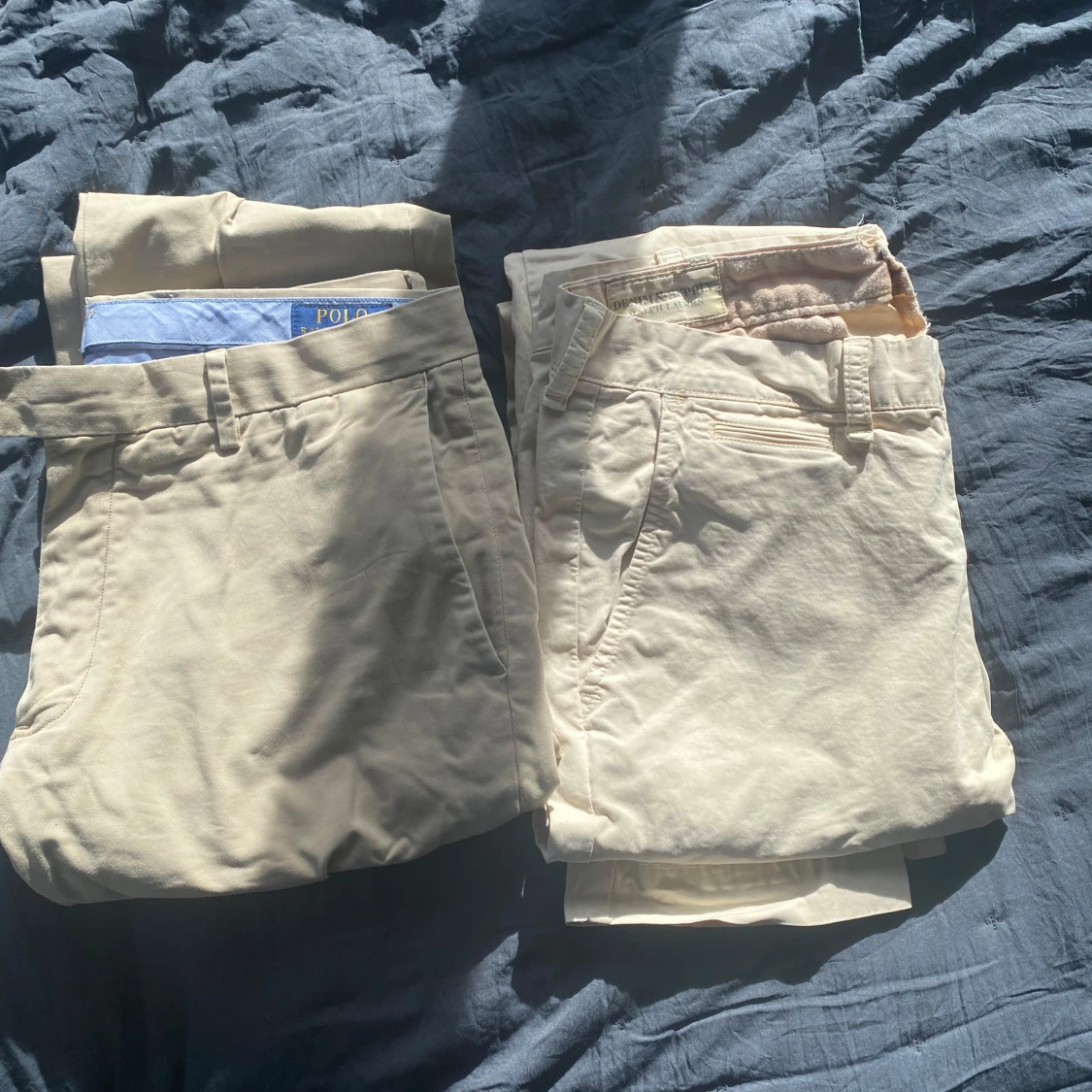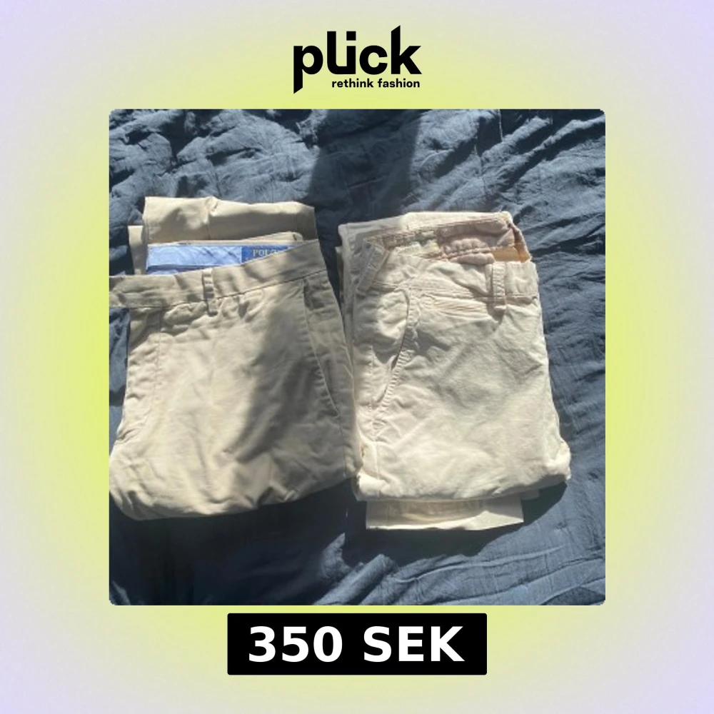 Säljer två stilrena beiga chinos från Polo Ralph Lauren. Byxorna har en klassisk design med fickor fram och bak, perfekt för en avslappnad men ändå uppklädd look. Passar bra till både vardag och mer formella tillfällen. W32L32