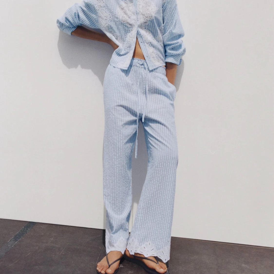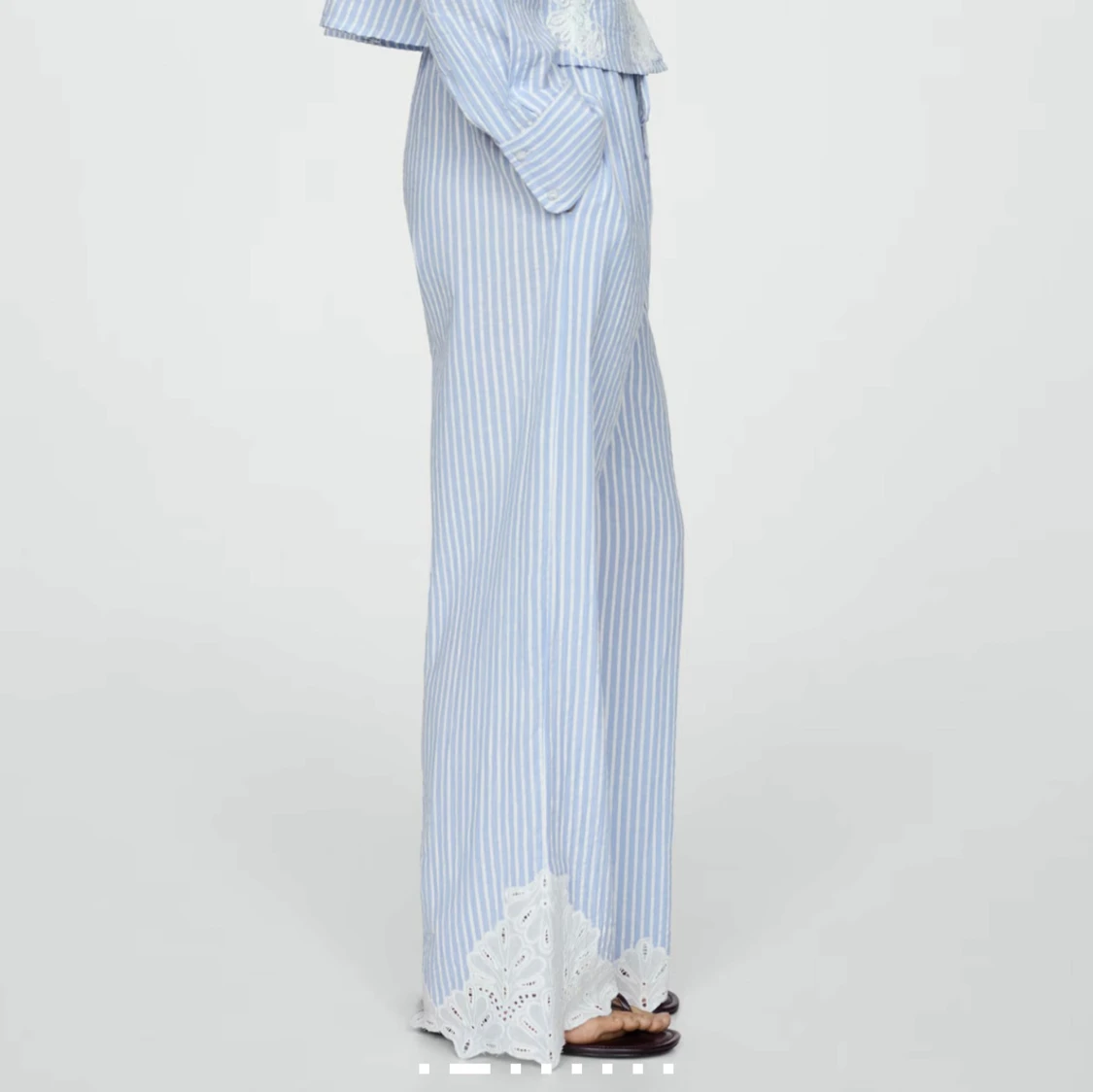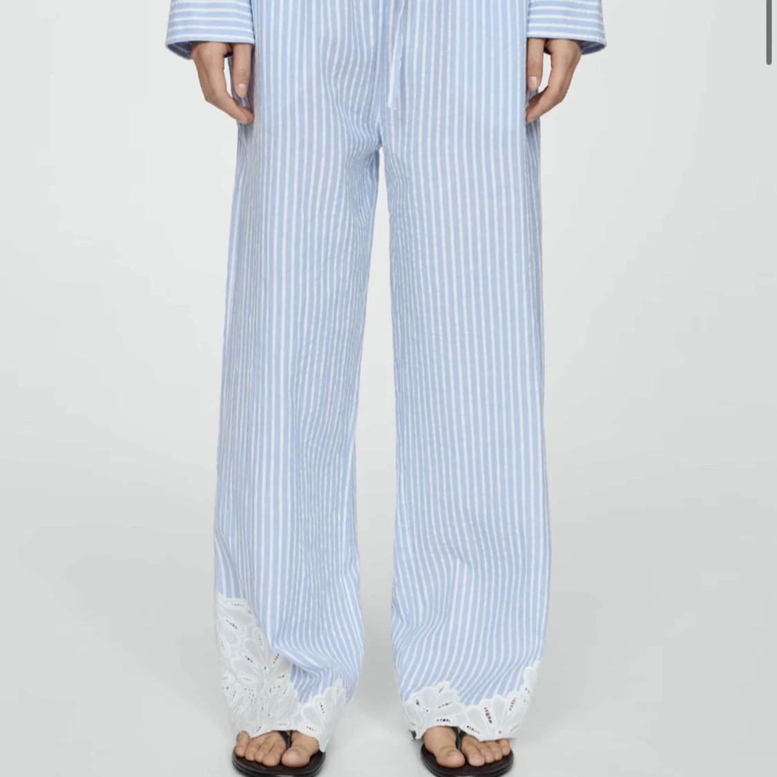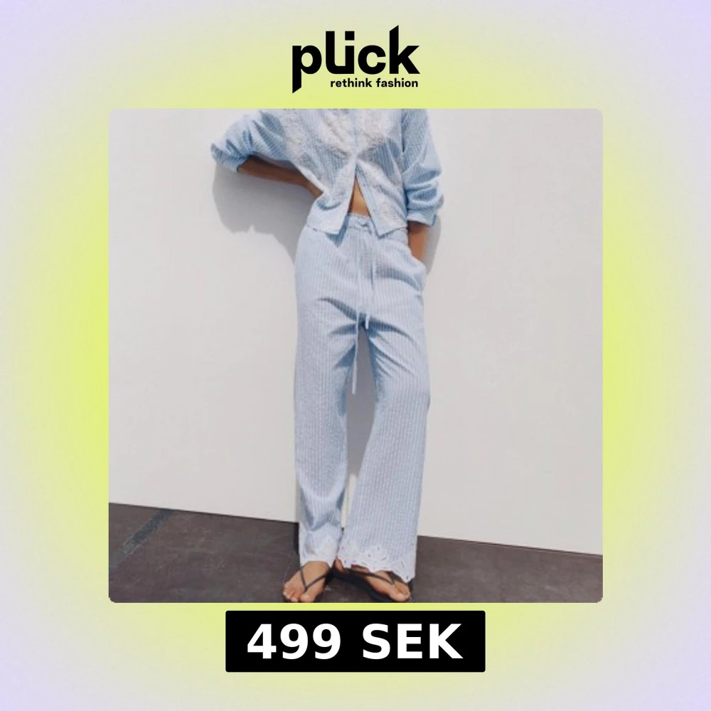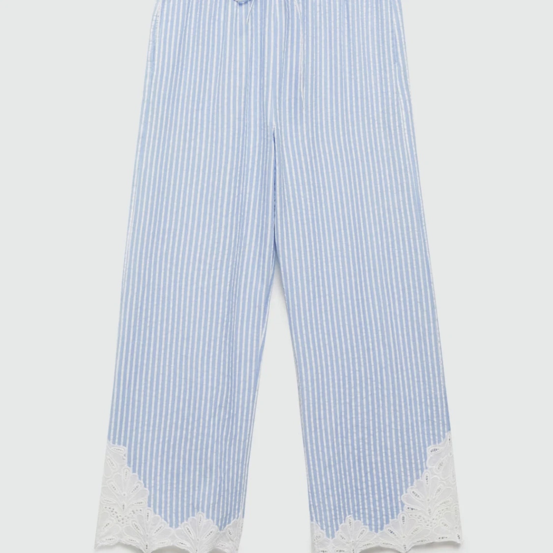 Säljer mina väldigt fina sommarbyxor! Blå vita byxor med vit spets ner till! Helt oanvända med prislapp kvar