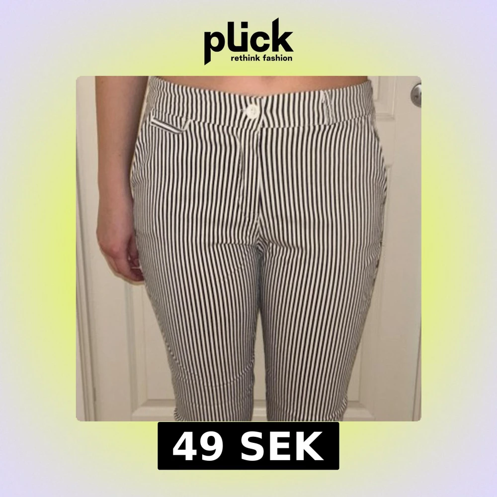 byxor med svartvita vertikala ränder och klassisk passform. Byxorna har fickor fram och bak.
