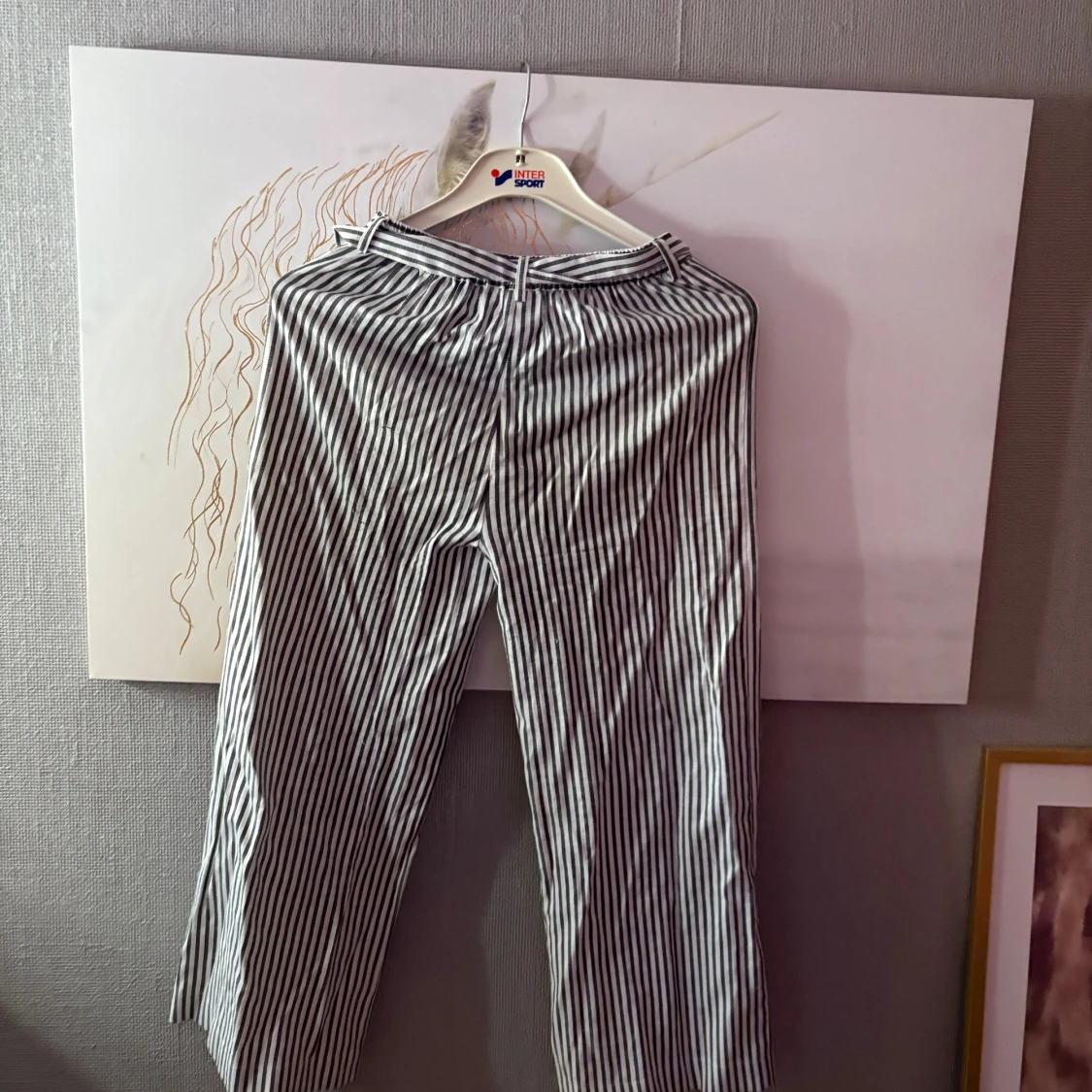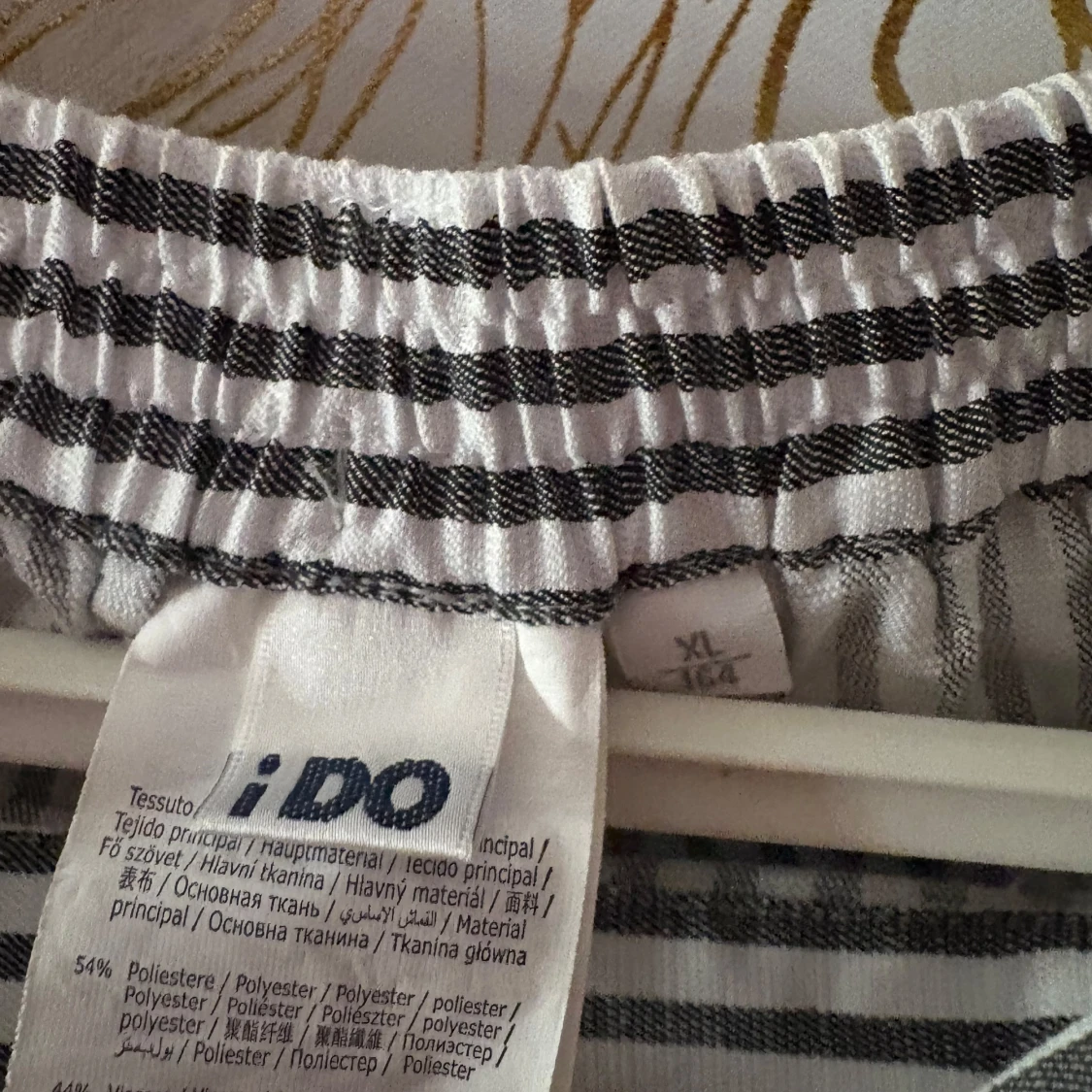 Snygga svartvita randiga byxor från iDO i storlek 164 Byxorna har elastisk midja och knytband framtill för extra stilpoäng. Tillverkade i mjuk polyesterblandning och har raka, lite loose ben. Perfekta för en chill och trendig look.
