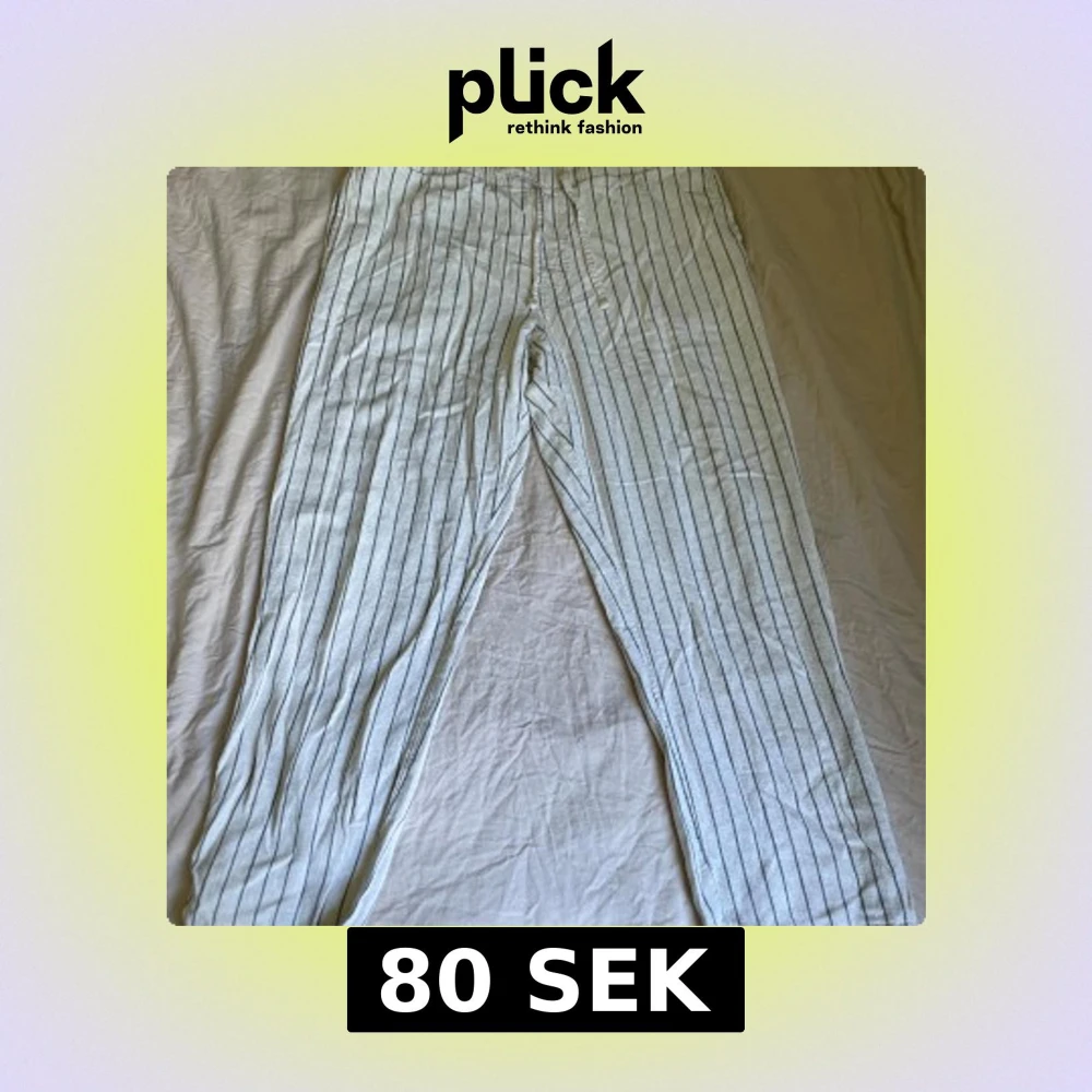 Snygga, ljusa linnebyxor från H&M med svarta vertikala ränder. Byxorna har normal passform och är tillverkade i en skön blandning av viskos och linne. Perfekta för en avslappnad och stilren look.