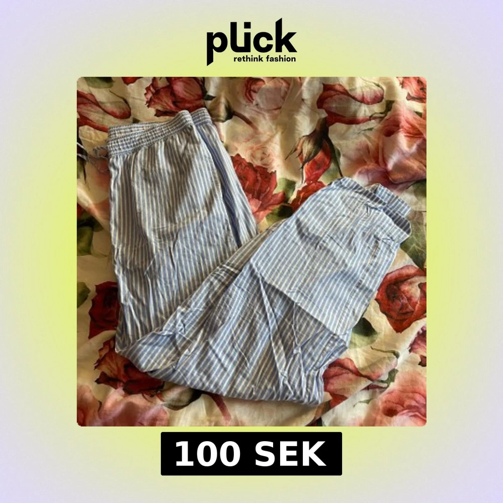 Blåvita linnebyxor från Kappahl i storlek M. Byxorna har smala vertikala ränder, resår i midjan och snörning framtill. Lätta och luftiga, perfekta för varma dagar. Klassisk och chill look med relaxed fit.