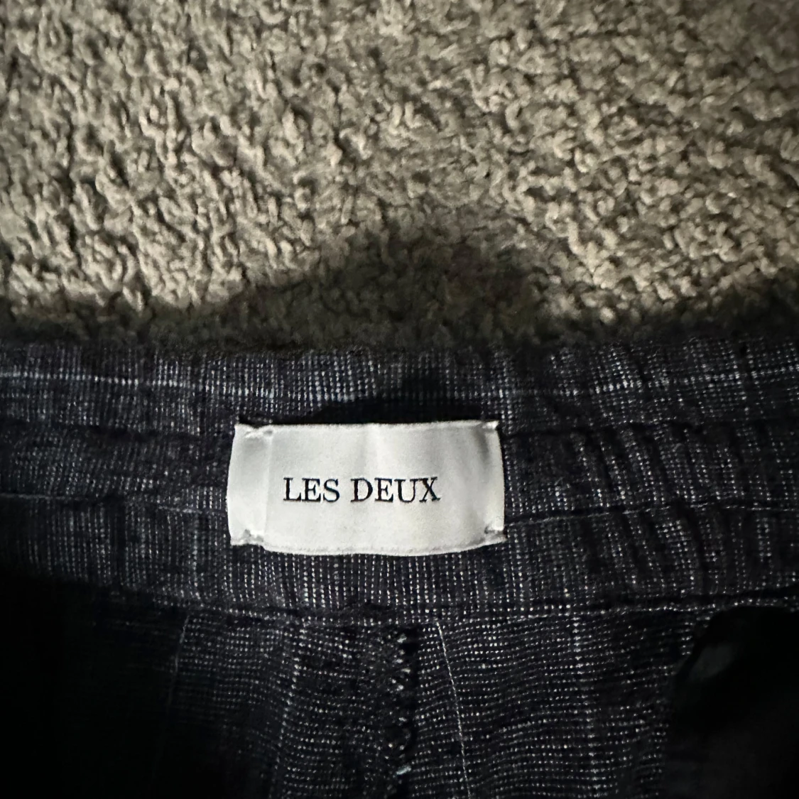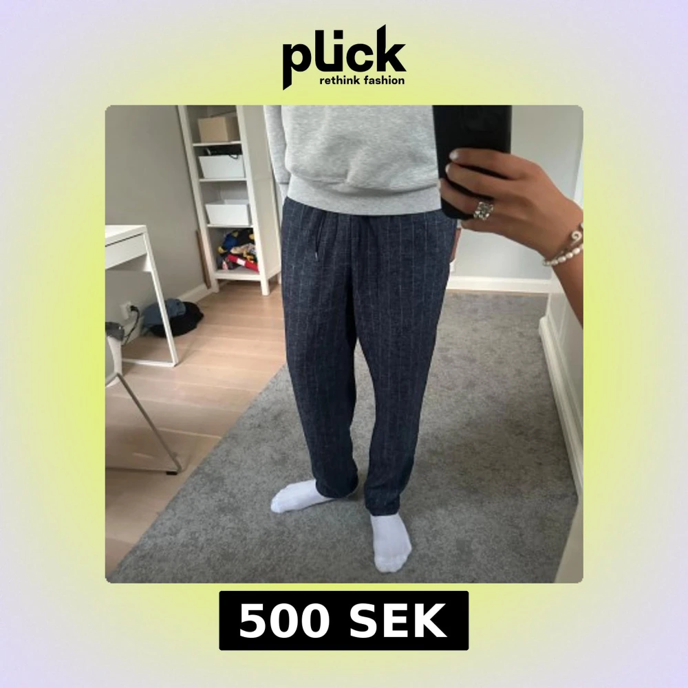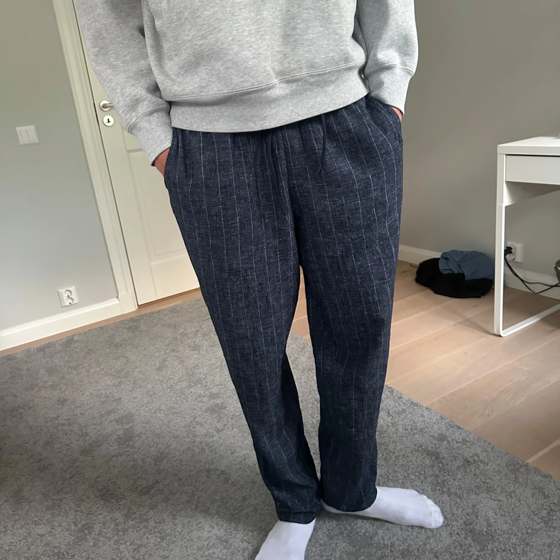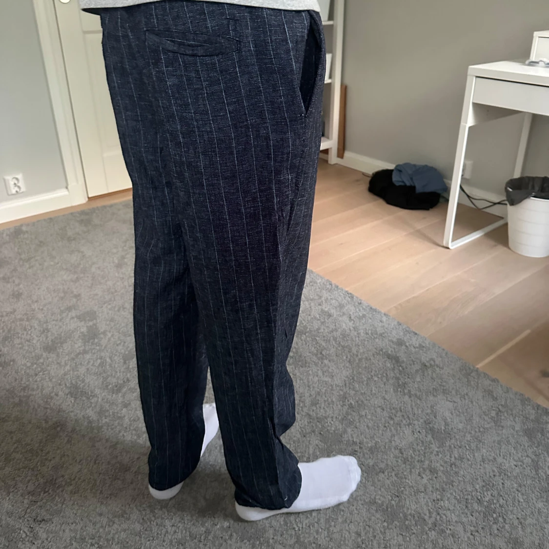 Mörkblå linnebyxor från Les Deux med smala vita ränder. Byxorna har avslappnad passform, storlek XL men sitter som L. Jag är 187 cm och de sitter som på bilderna. Köptes i somras och knappast använda!