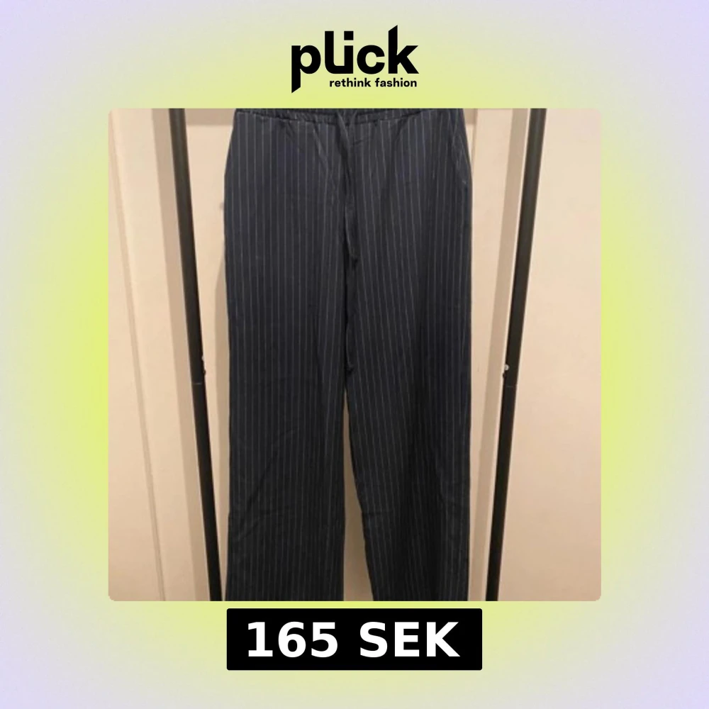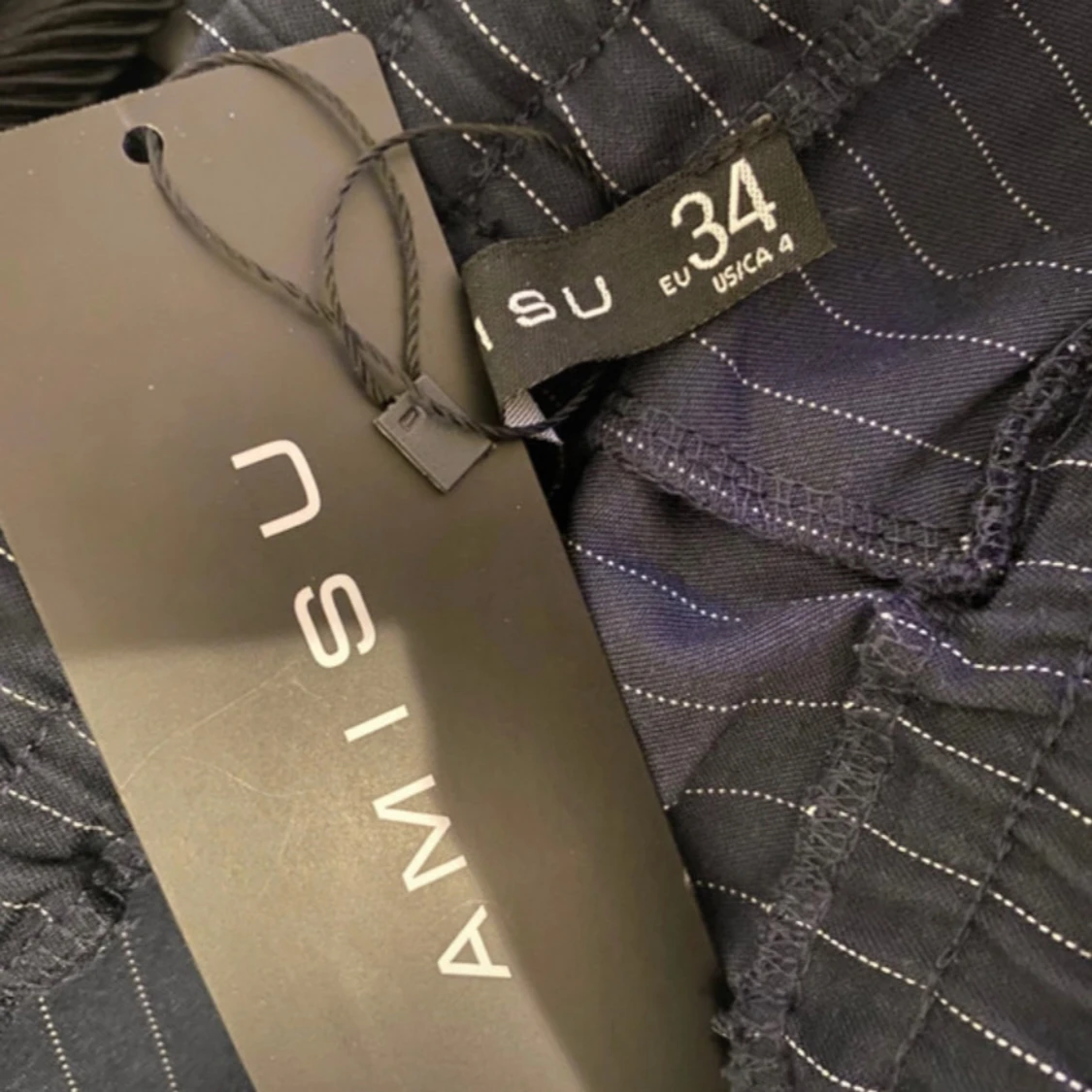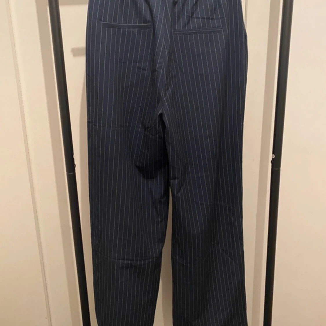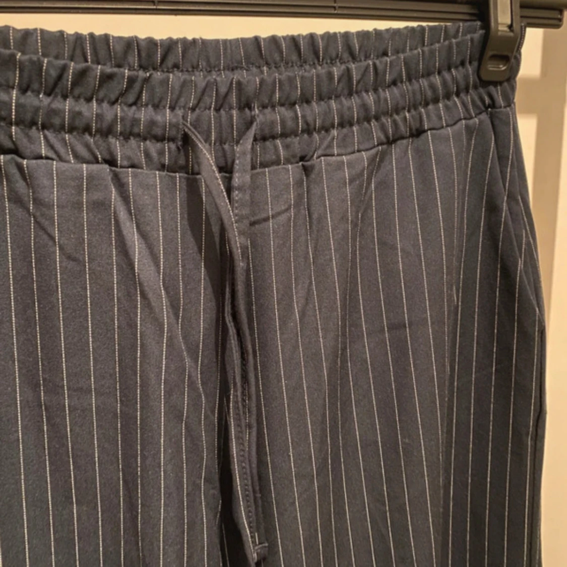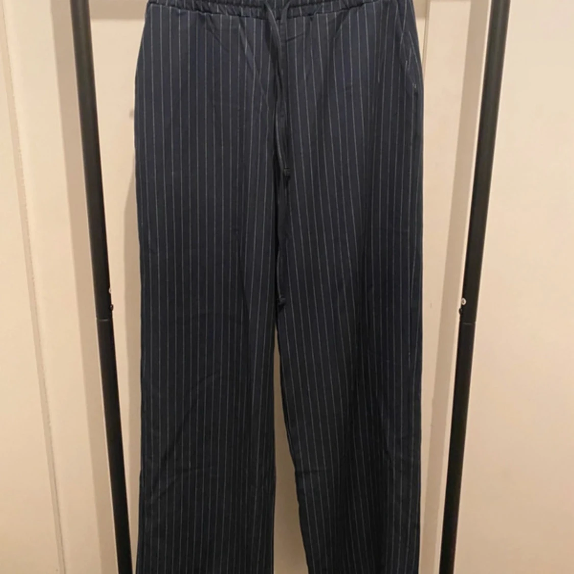 Snygga mörkblå byxor från Amisu med vita tunna ränder. Modellen är wide med resår och snörning i midjan för extra komfort. Byxorna har raka ben och är perfekta för en chill och trendig look. Aldrig använda