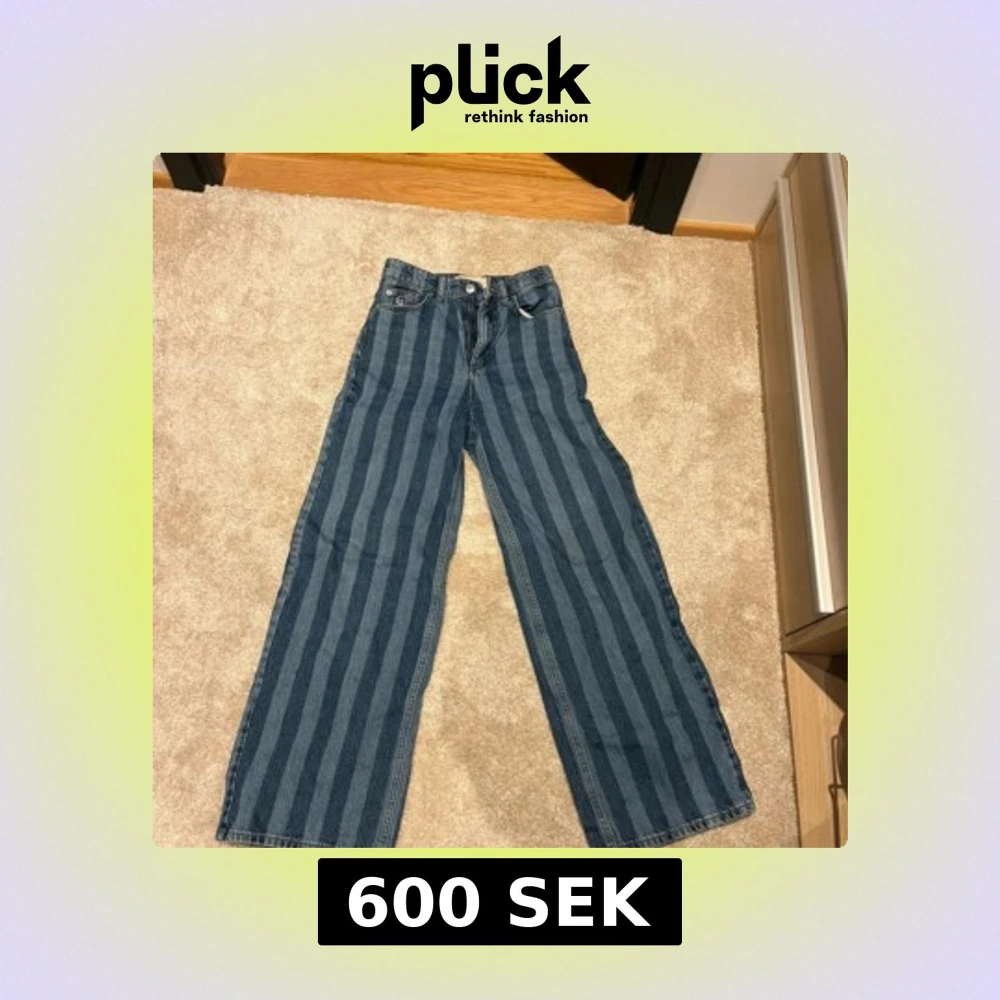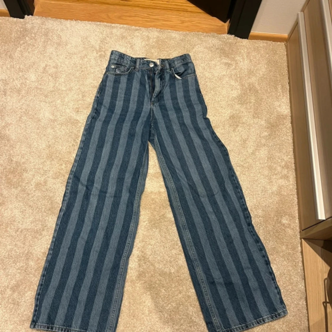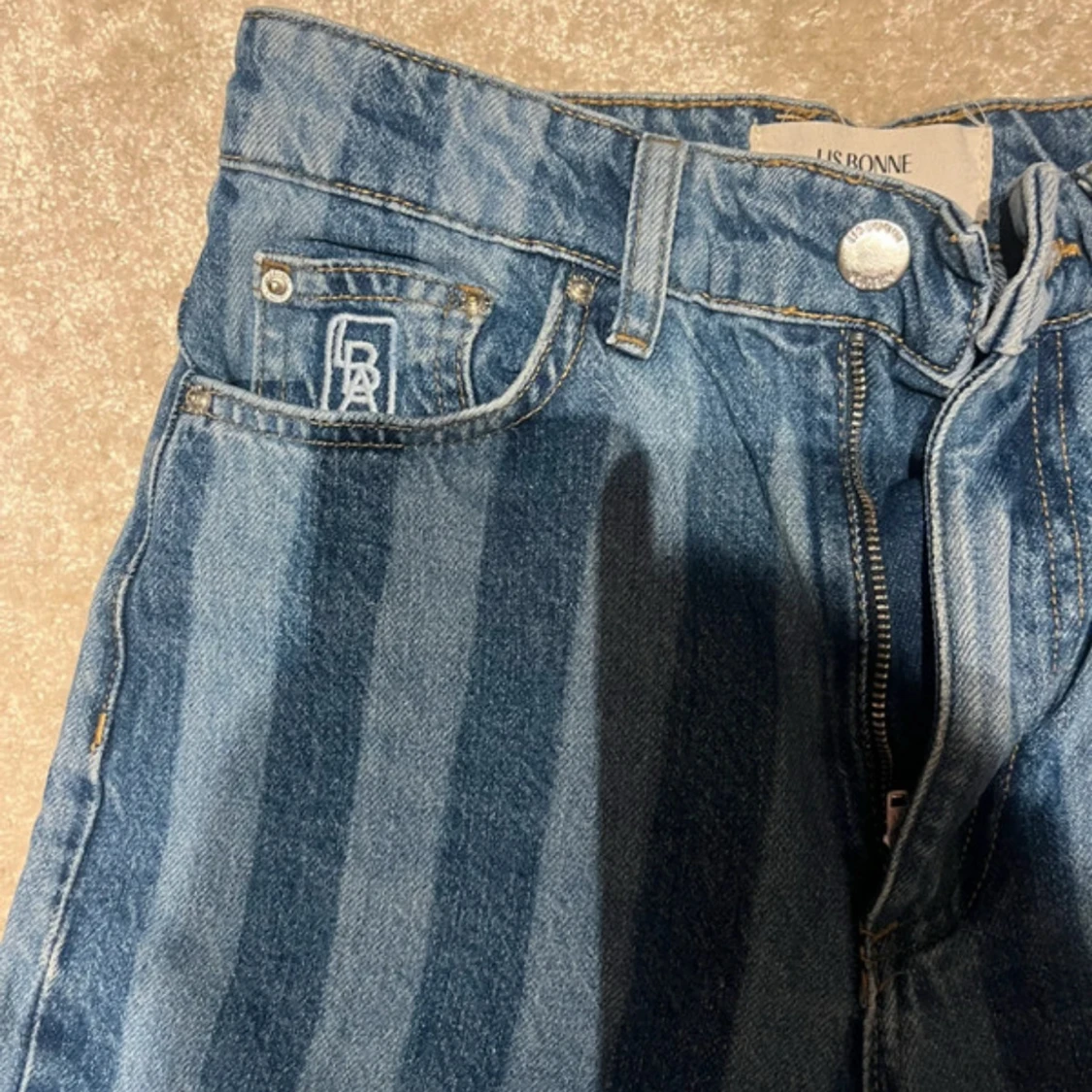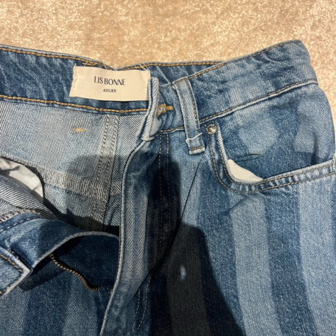 Säljer ett par blå jeans med breda vertikala ränder från Lis Bonne Atelier. Modellen är wide med hög midja och klassisk femficksdesign. Jeansen har dragkedja och knapp framtill, samt broderad logga på myntfickan. Perfekt för dig som gillar statement-plagg.