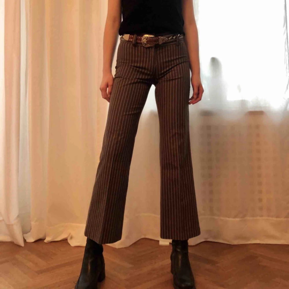 Utsvängd byxa i brunt med smala beiga ränder. Material: bomullsblandning. Stlk. S, normallängd. Köparen står för frakt, kan även mötas upp!