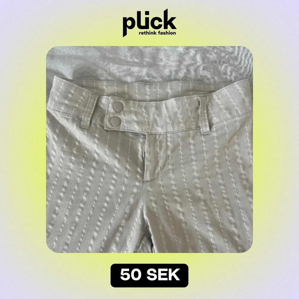 Beiga, vitrandiga, lågmidjade kostymbyxor. Kommer från H&M och är använda runt fem gånger😊😊. Skriv för fler bilder🙃🫶.