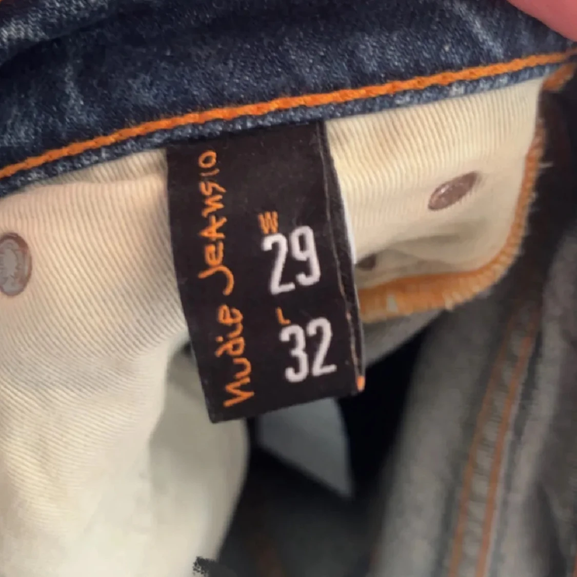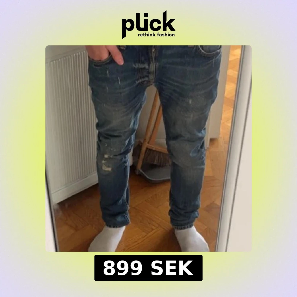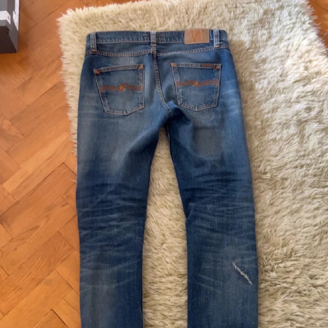 Säljer ett par blå slim fit jeans från Nudie med slitningar och snygga detaljer på bakfickorna. Perfekta för dig som gillar en smalare passform! Detta är en limited model med slitningar som inte säljs längre, där av priset! De är i jättebra skick (9,5/10), utan några defekter! Mitt pris är 899 där av att dem är limited och inte säljs längre! Nypris på dem när dem såldes var 2399! Priset är inte hugget i sten och kan diskuteras! Det är bara att skriva vid minsta fråga:)