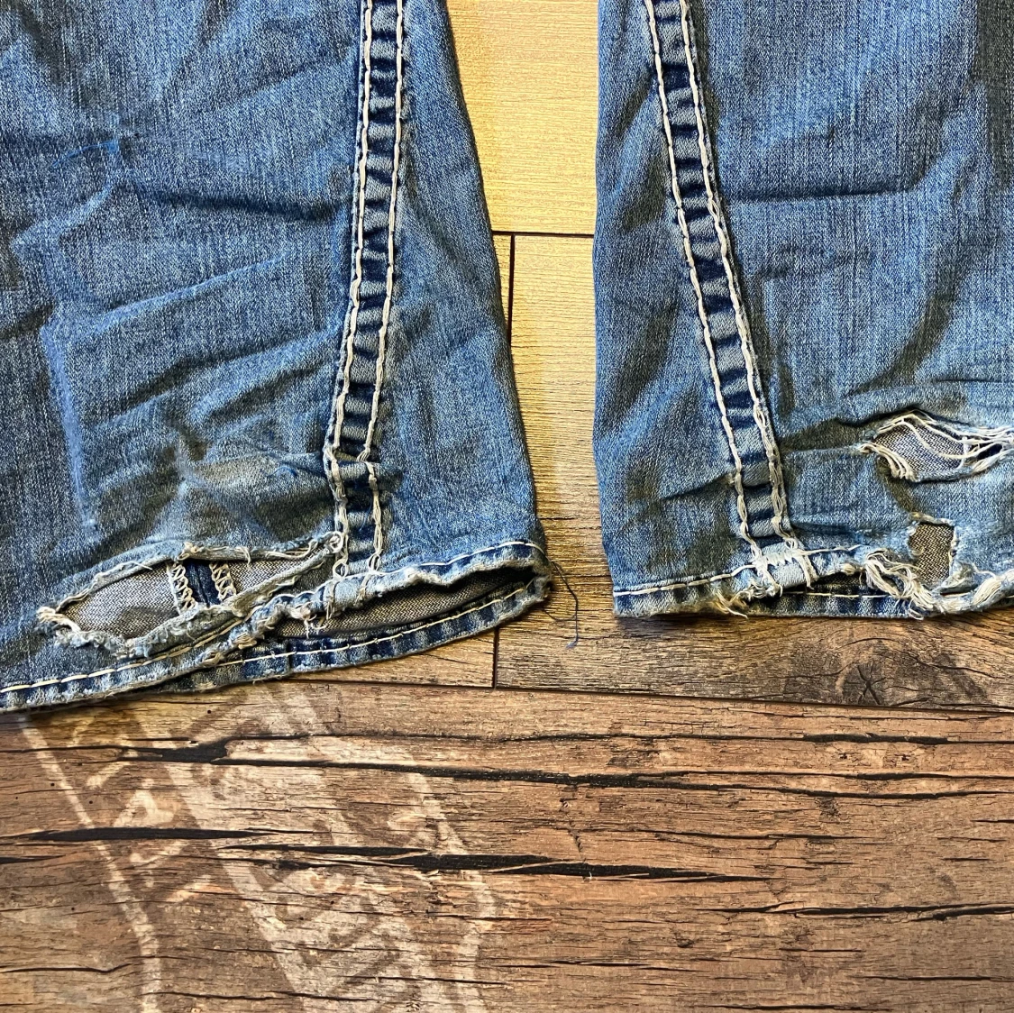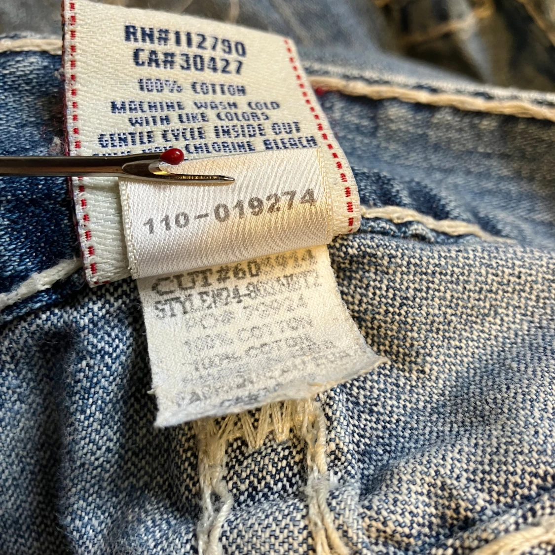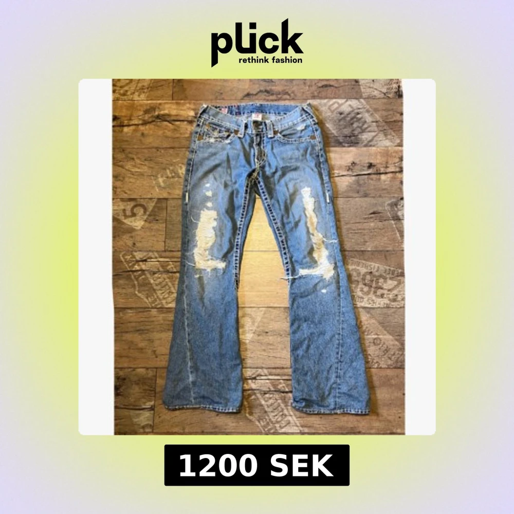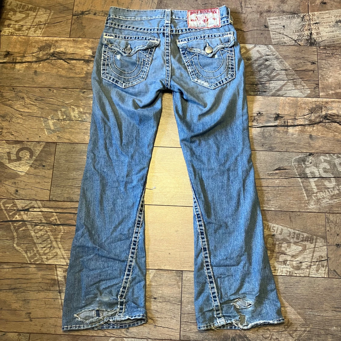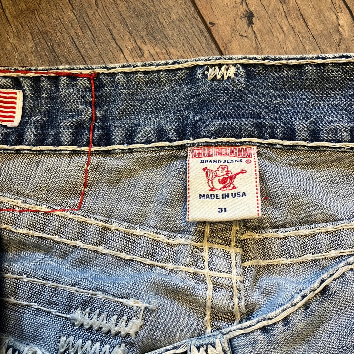 Säljer ett par blå jeans från True Religion med bootcut passform och slitna detaljer framtill. Jeansen har klassiska fickor med dekorativa sömmar och knappar bak med vita thick stitches. Slitage vid benöppningen (kolla sista bilden) annars mycket bra skick! Pris kan diskuteras:)