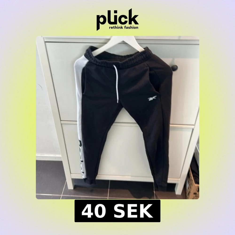 Säljer ett par svarta mjukisbyxor från Reebok med vit sidopanel och snörning i midjan. Byxorna har en avslappnad passform och är perfekta för en bekväm stil. Reebok-loggan är broderad på benet.