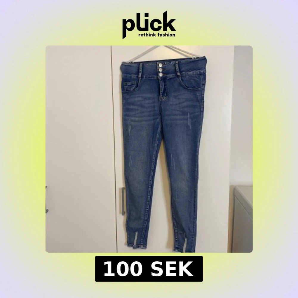 Snygga blå skinny jeans från SHEIN med hög midja och tre knappar framtill. Jeansen har slitna detaljer, klassiska fickor och smal passform hela vägen ner. Perfekta för dig som gillar en tajt look och vill ha ett par stilrena jeans i garderoben.