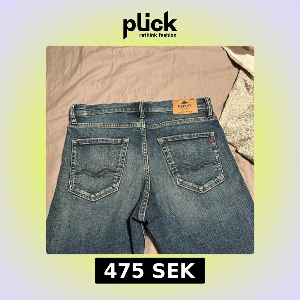 Säljer ett par klassiska blå jeans från Replay med snygga slitningar och raka ben. Jeansen har fem fickor, tydliga sömmar och Replay-logga på bakfickan. Passar dig som gillar en tidlös och chill stil. Köpte dom för 1100kr nya.