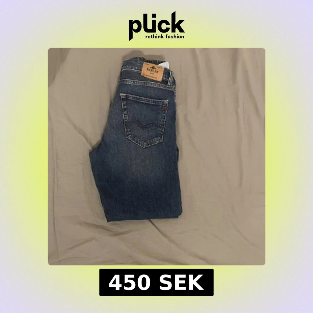 Snygga blå jeans från Replay, modell Thad. Klassisk femficksdesign med raka ben och normal passform. Jeansen har en mörk tvätt med lätt slitning och tydliga sömmar. Perfekta för dig som gillar en enkel och stilren look.