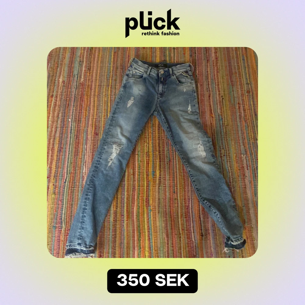 Säljer ett par snygga blå jeans från Replay i bra skick. (Bara använt en gång)De har en slim passform med slitna detaljer och fransiga benslut för en snygg look.