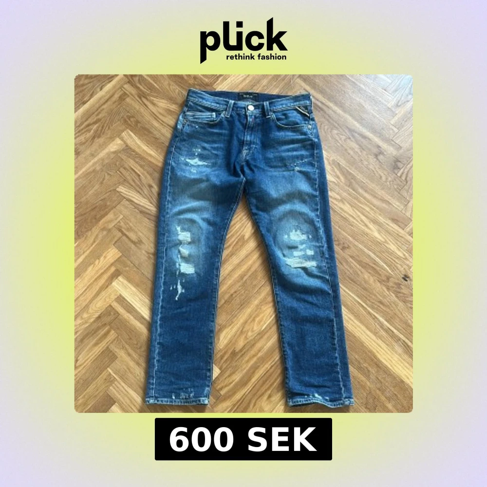 Mörkblå jeans från Replay, modell Mini Waitom. Klassisk femficksdesign med raka ben och slitna detaljer på både fram- och baksida. Jeansen har knappgylf och tydliga Replay-loggor på fickorna. Perfekta för en avslappnad stil.