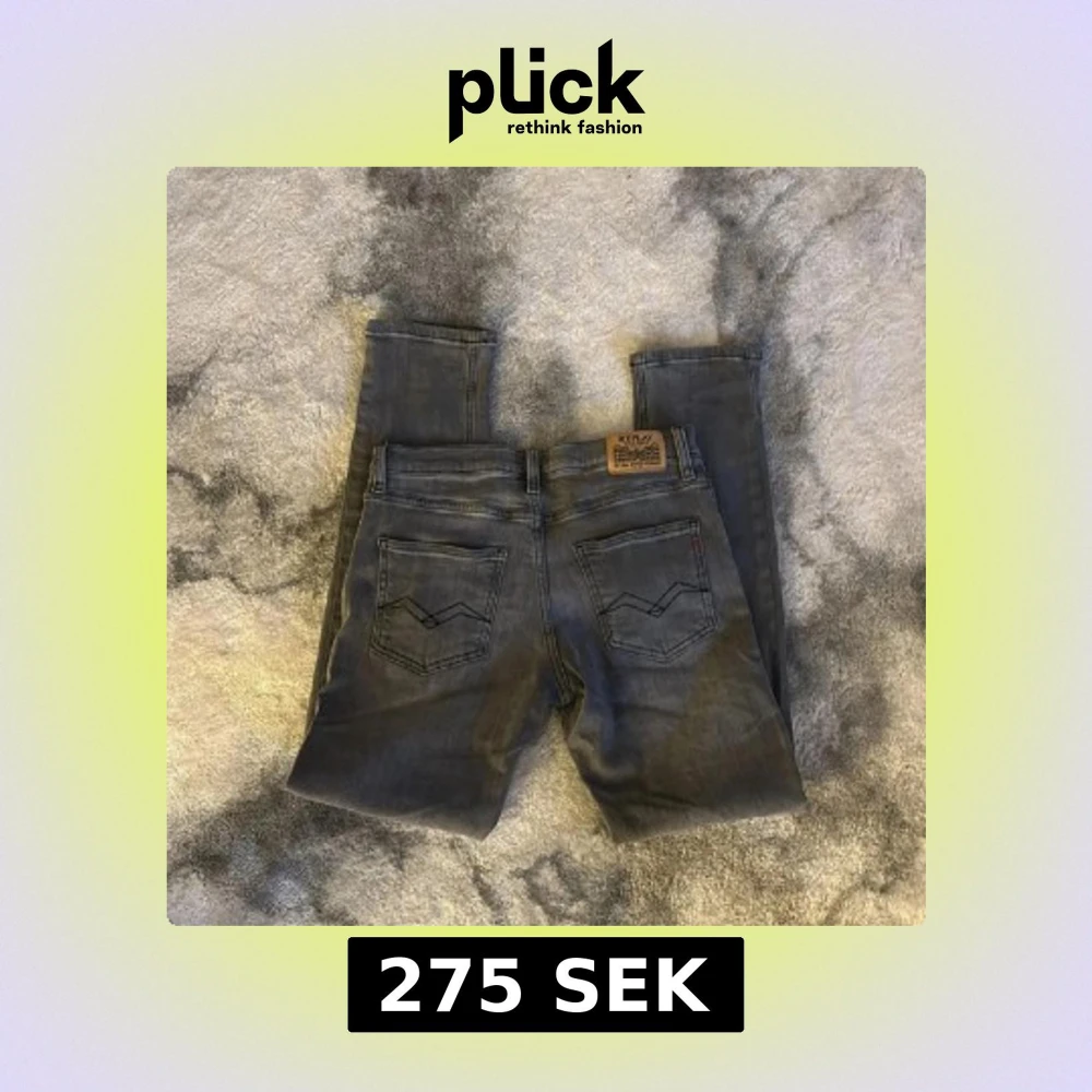 Säljer ett par grå jeans från Replay med klassiska bakfickor och snygg tvätt. Jeansen har raka ben och en stilren look, perfekta till sneakers eller boots. Märkespatch bak i midjan och diskreta detaljer.