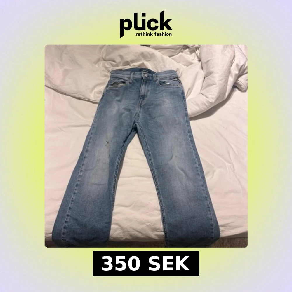 Säljer ett par ljusblå jeans från Replay. De har en klassisk femficksdesign och en knappgylf. Perfekta för en avslappnad stil. 165 cm lång