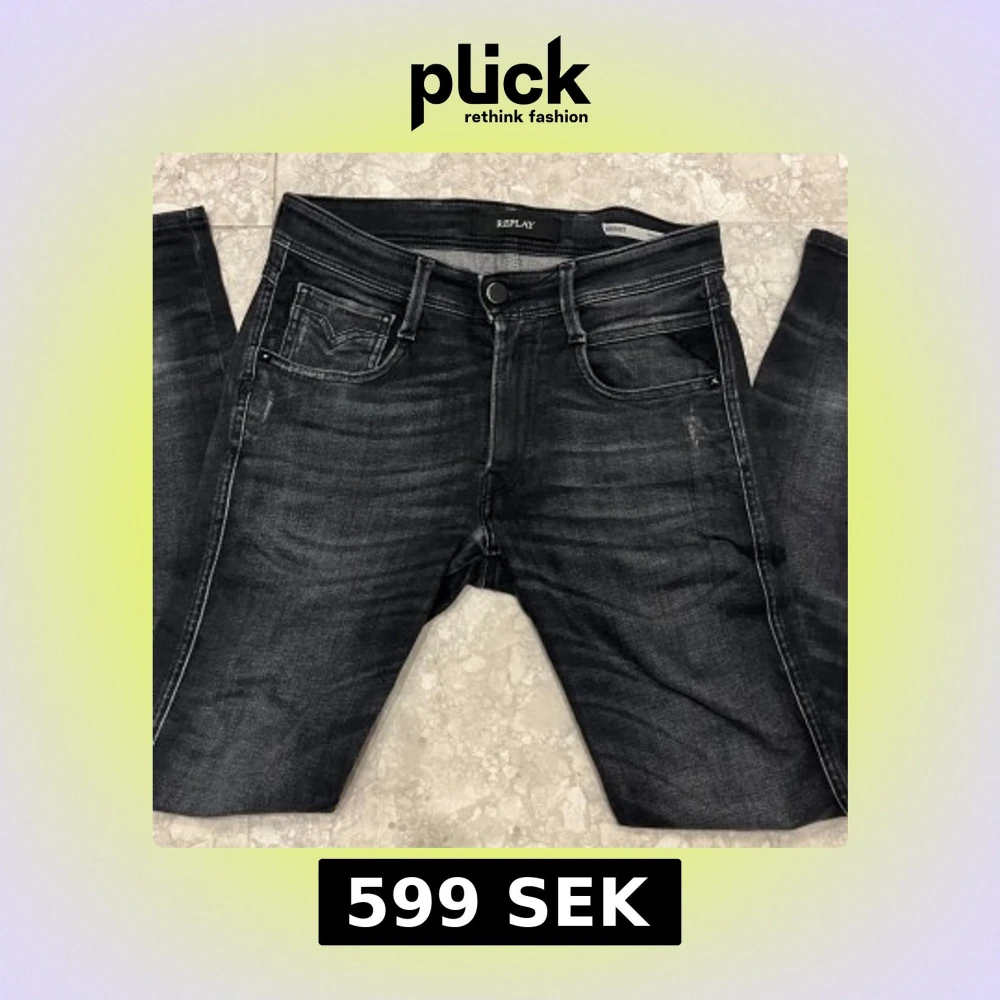 Snygga svarta Replay jeans med slitna detaljer och grå tvätt. Klassisk femficksmodell med dragkedja och knapp. Jeansen har en smal passform och är tillverkade i stretchigt bomullsmaterial för extra komfort. har gått upp lite på lappen där bak men går att fixa