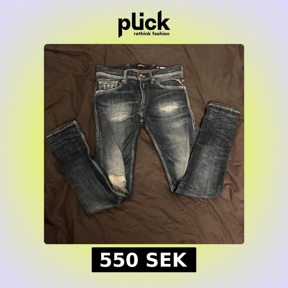 Snygga mörkblå Replay Jondrill jeans med slitna detaljer, dom sitter lite smått skinny och är storlek 27:30. Jag är öppen för en viss del prutning men inga skambud. Kom pm om ni har några frågor eller funderingar!🤩🙌🍾