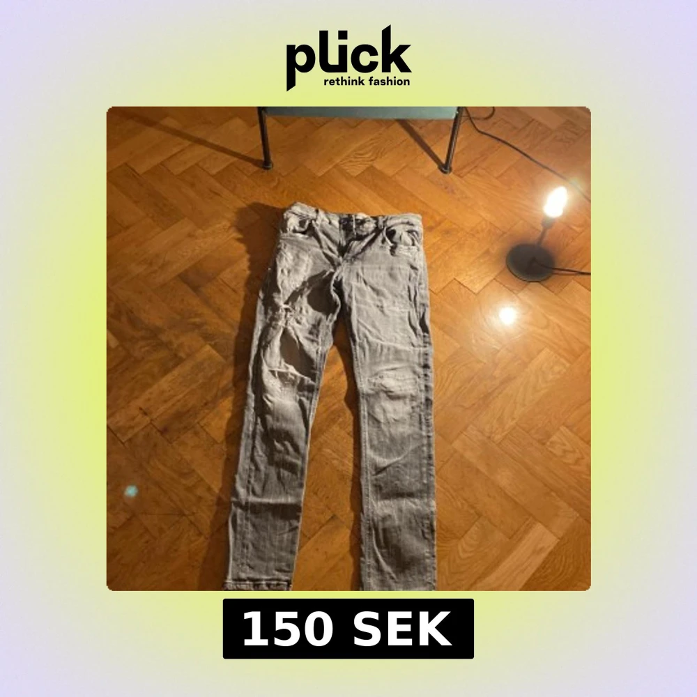 Säljer ett par grå jeans från Replay med snygga slitningar på benen. Jeansen har klassisk femficksdesign, raka ben och normal passform. Perfekta för dig som gillar en avslappnad och trendig look. Materialet är jeans och färgen är en tvättad grå nyans.