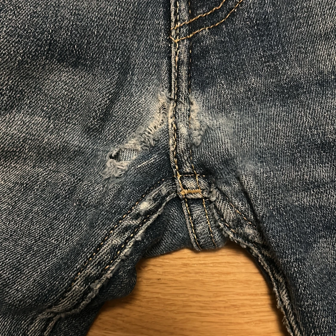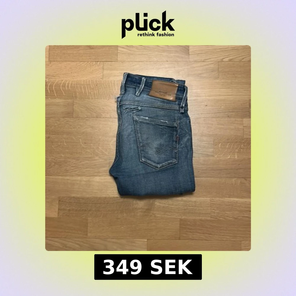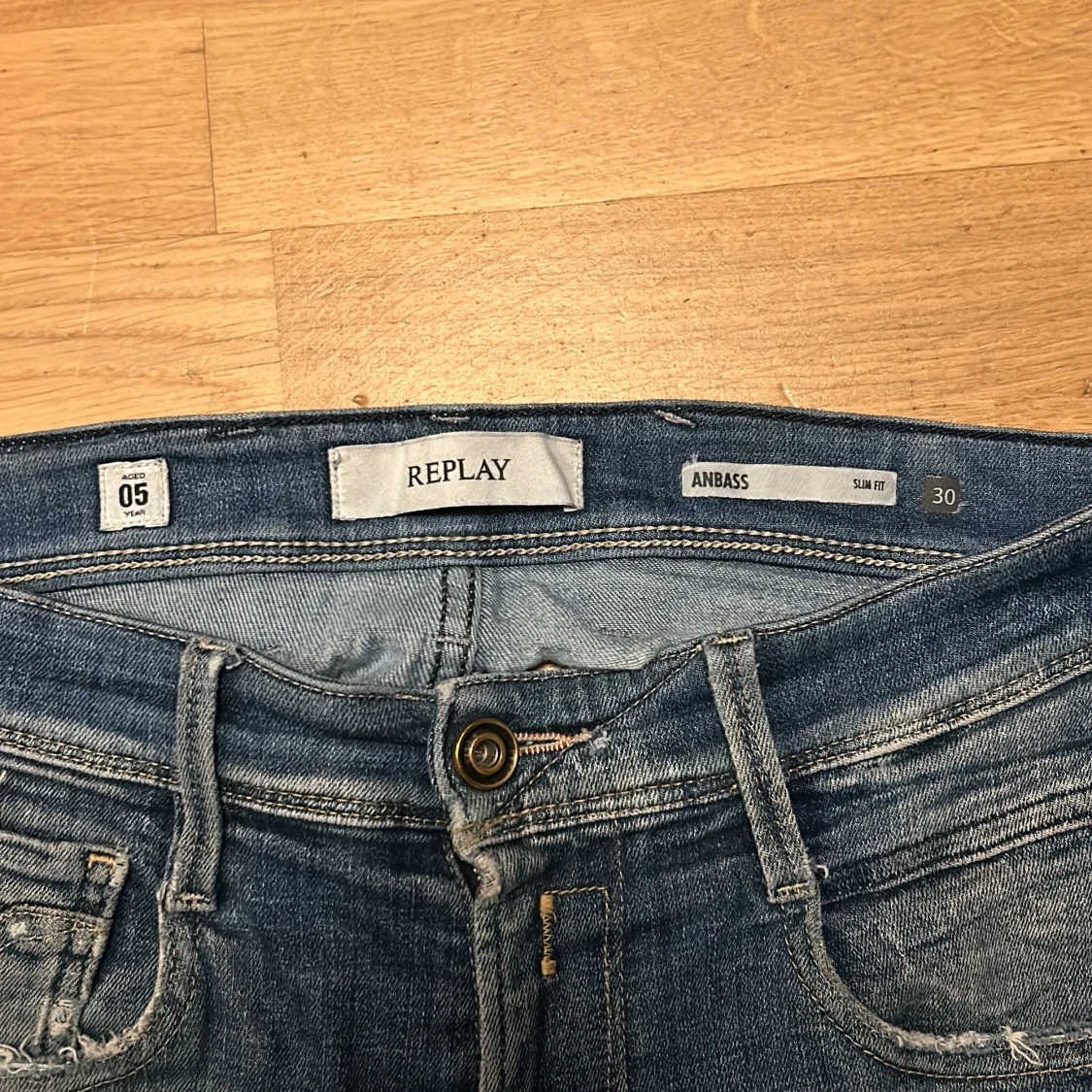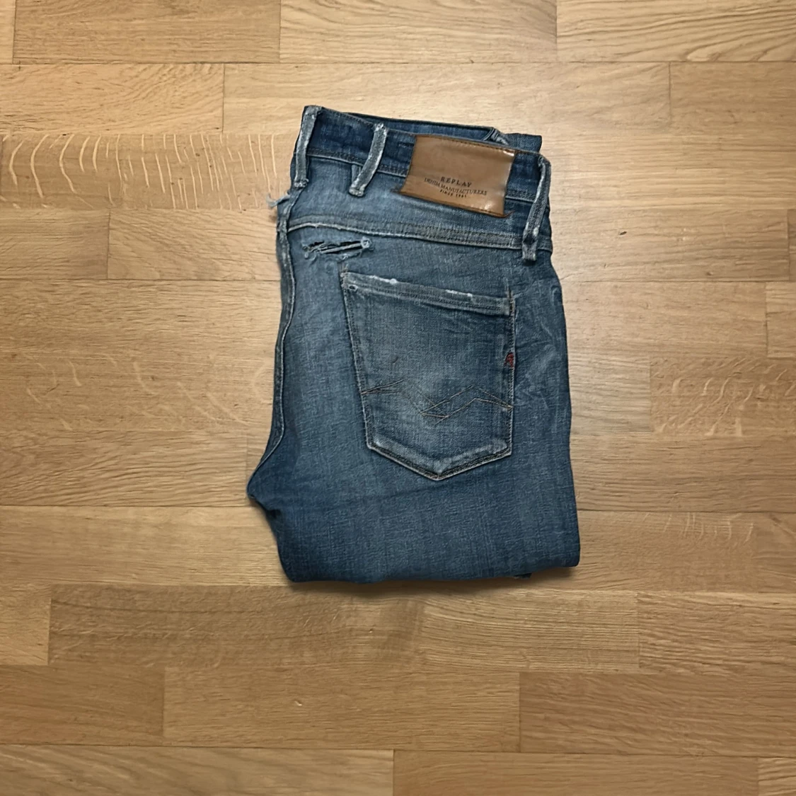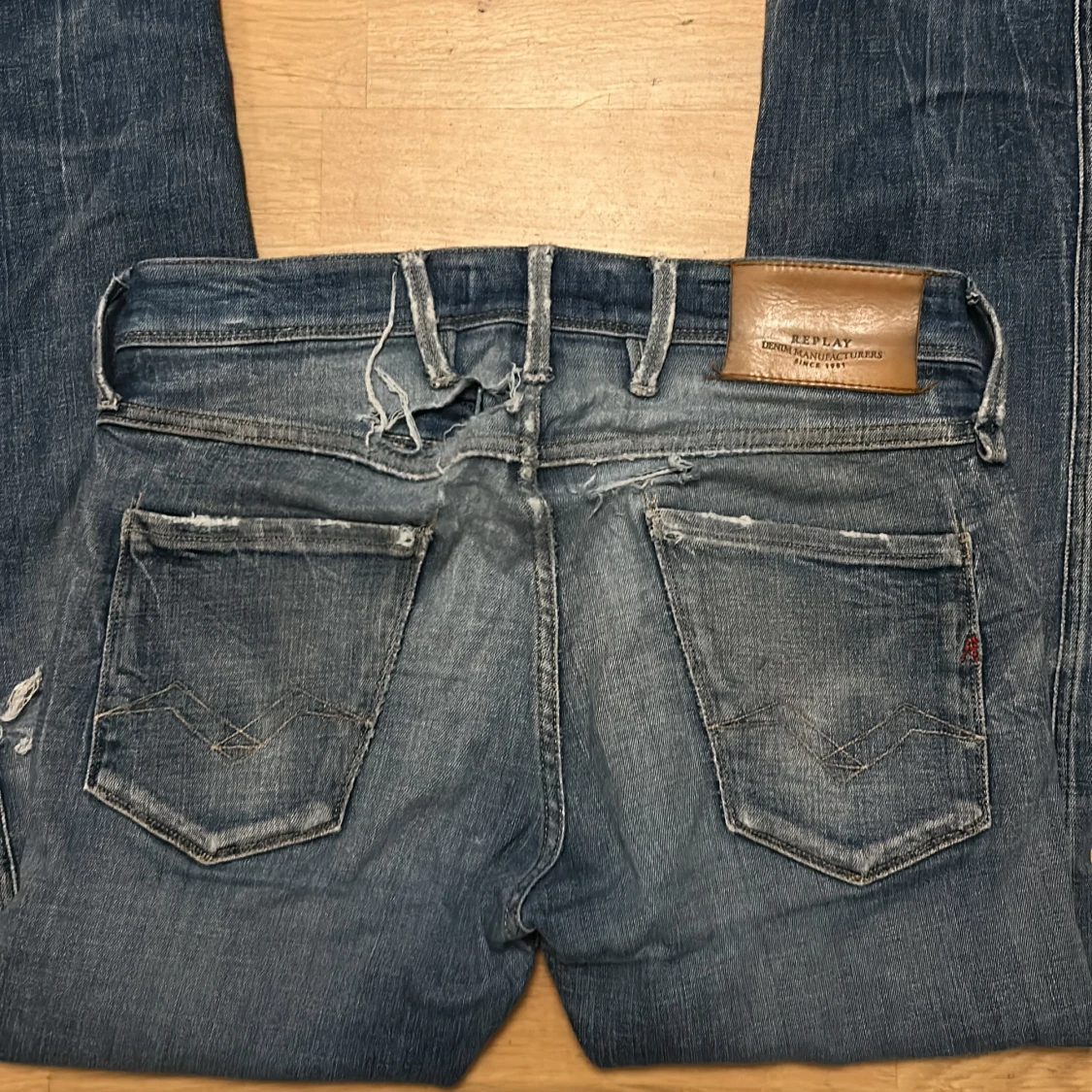Säljer ett par Replay Anbass jeans i slim fit med snygga slitningar och hål för en cool, avslappnad look. Färgen är klassiskt blå med ljusare tvätt och detaljer som bruna läderpatch och fem fickor. Perfekt för dig som gillar streetstyle och vill ha jeans med attityd. 30/32