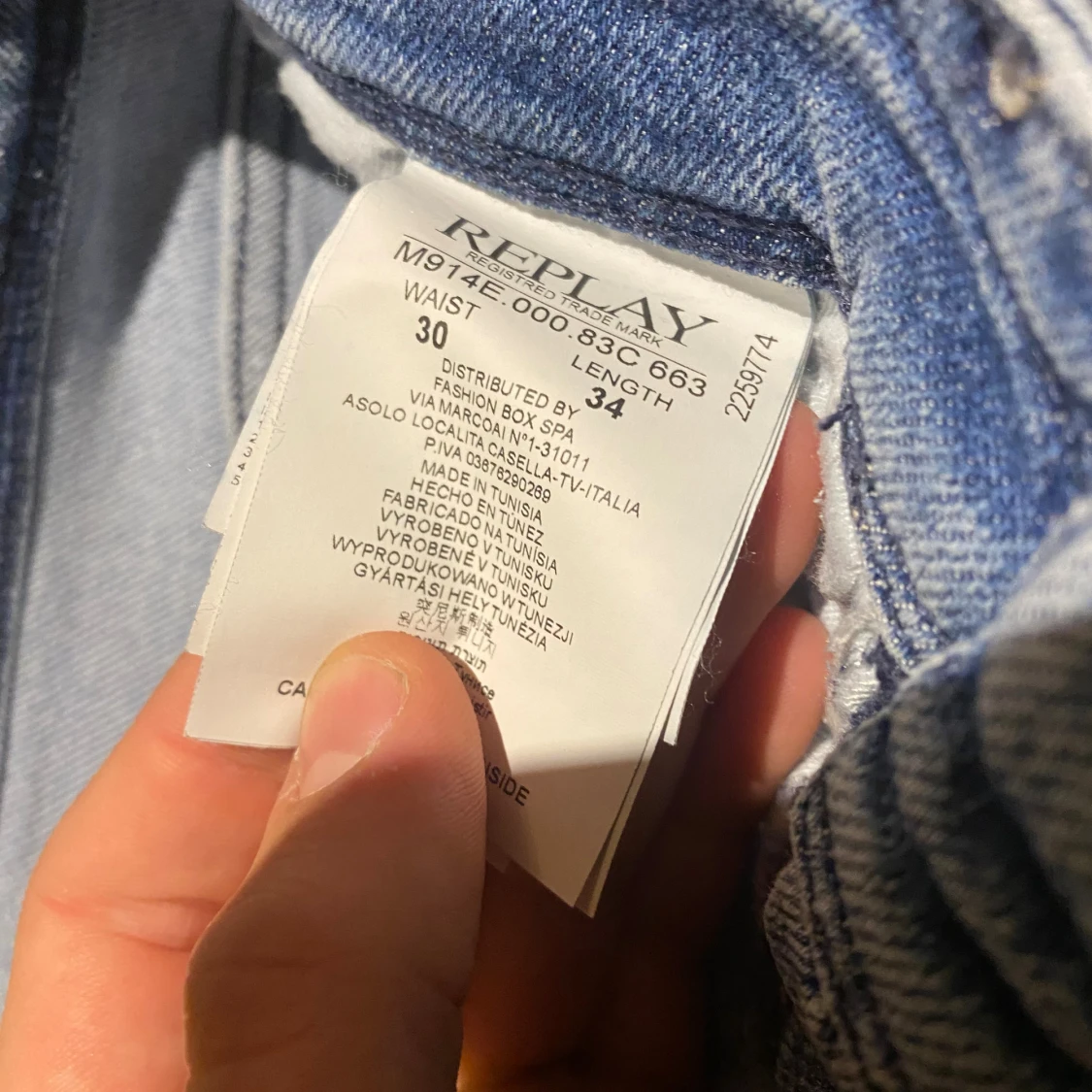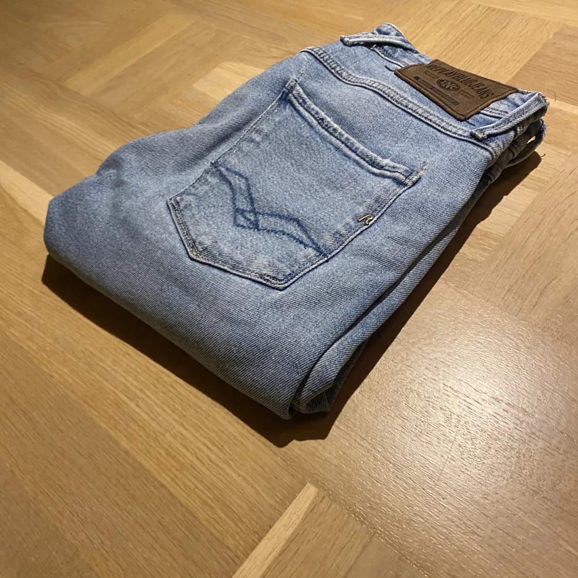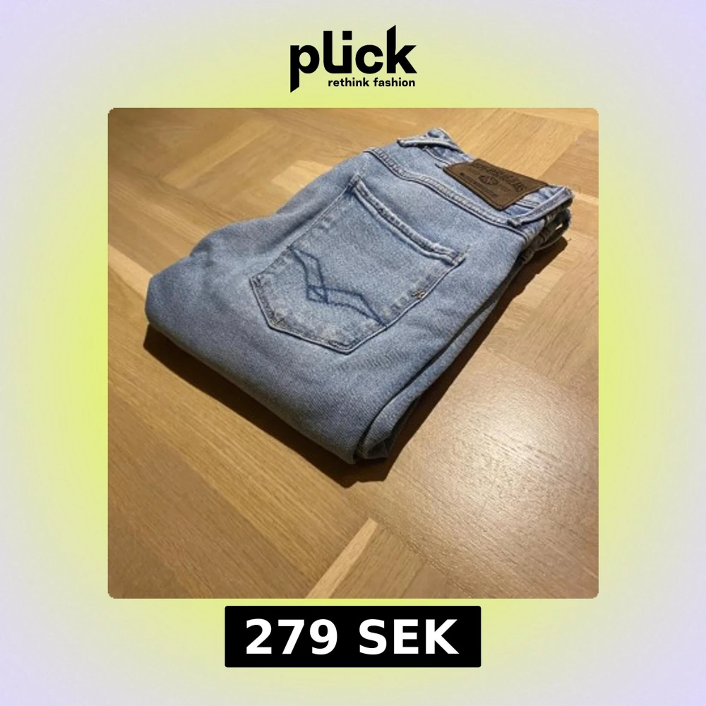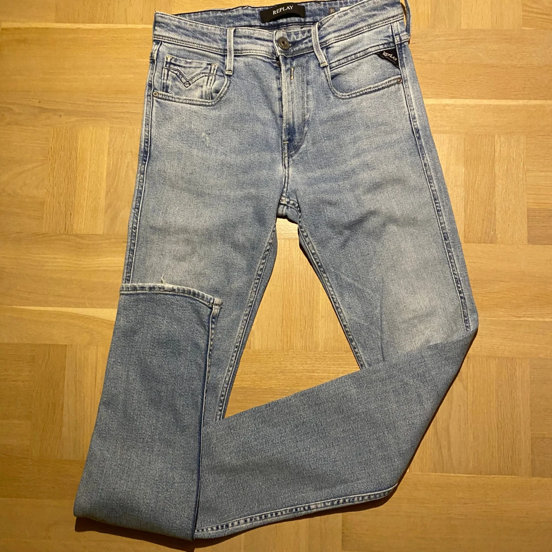Säljer ett par ljusblå jeans från Replay i modellen Anbass. Klassisk femficksdesign, diskreta slitningar och snygga detaljer på bakfickan. Jeansen har normal passform och är tillverkade i mjukt denimtyg. Perfekta för dig som gillar en avslappnad men stilren look. De har ett par riktigt feta slitningar som passar grisch stilen🤑 De är använda men fortfarande i okej skick