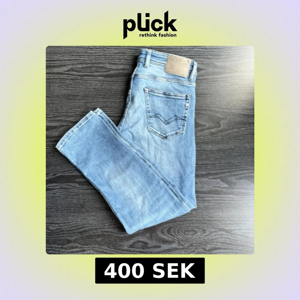 Säljer ett par ljusblå jeans från Replay med klassisk femficksdesign och snygga slitningar. Jeansen har raka ben och normal passform, med Replay-logga på myntfickan och bakfickan. Jeans är i storlek 30/30 och använts bara ett fåtal gånger