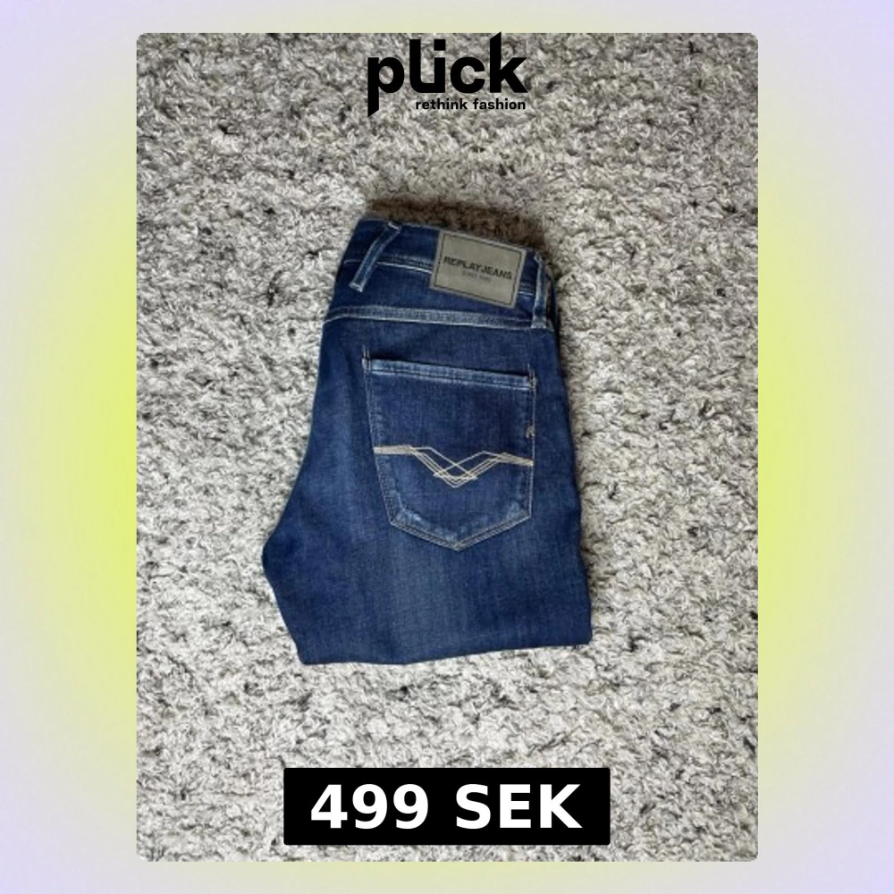 Snygga Replay Anbass jeans i mörkblå tvätt med slitningar och detaljerade sömmar på bakfickorna. Storlek W30 L30. Nypris ligger på cirka 1799 men mitt pris är endast 599!
