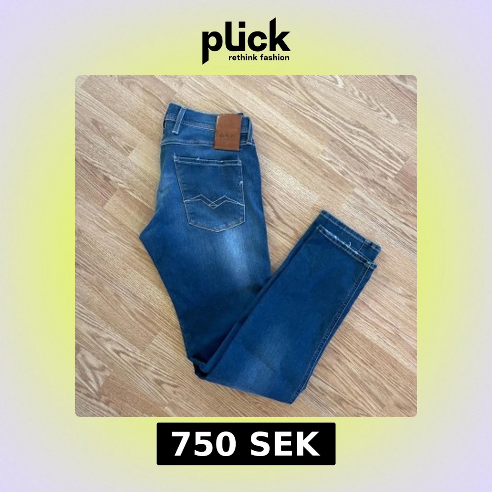 Snygga blå jeansbyxor från Replay med klassisk femficksdesign och läderpatch bak i midjan. Jeansen har raka ben och diskreta slitningar för en trendig look. Frakt ingår ej