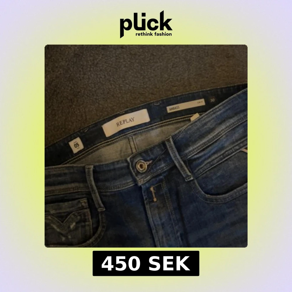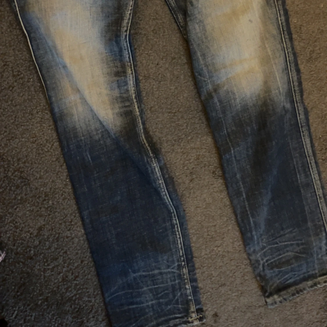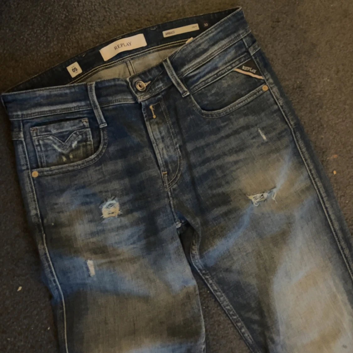 Säljer ett par feta replay anbass aged 05 med galet snygga slitningar!!! Storleken 30/32! Defekt se bild 4 , blå målarfärg men enligt mig passar bra in och gör att jeansen får en fet look!