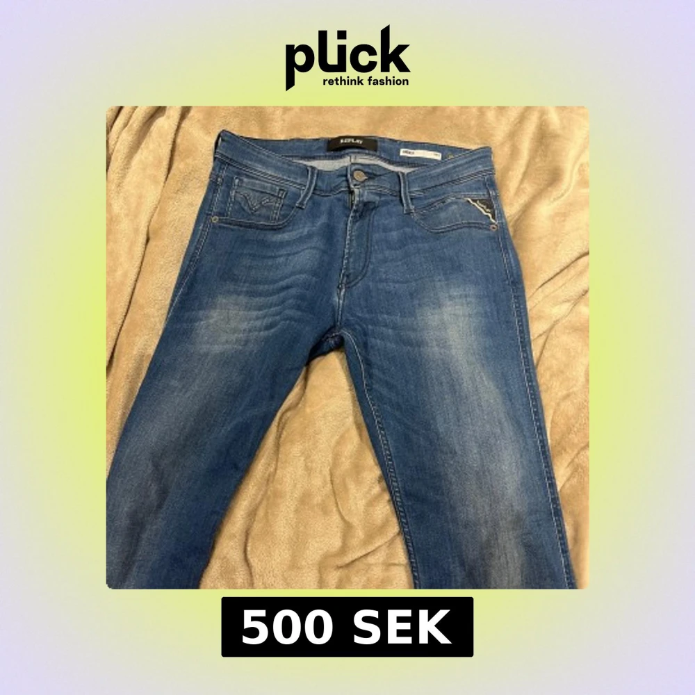 Snygga blå Replay Anbass jeans i slim fit med detaljer på bakfickorna.Jeansen har en lätt tvättad look och är tillverkade i mjukt denimtyg som sitter skönt hela dagen. Jeansen är i väldigt bra skick, köpta för omkring 1200 mitt pris 500