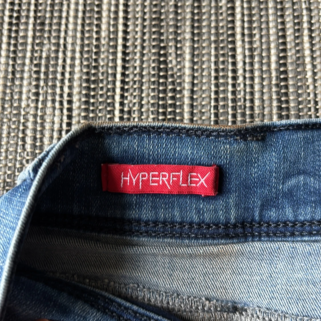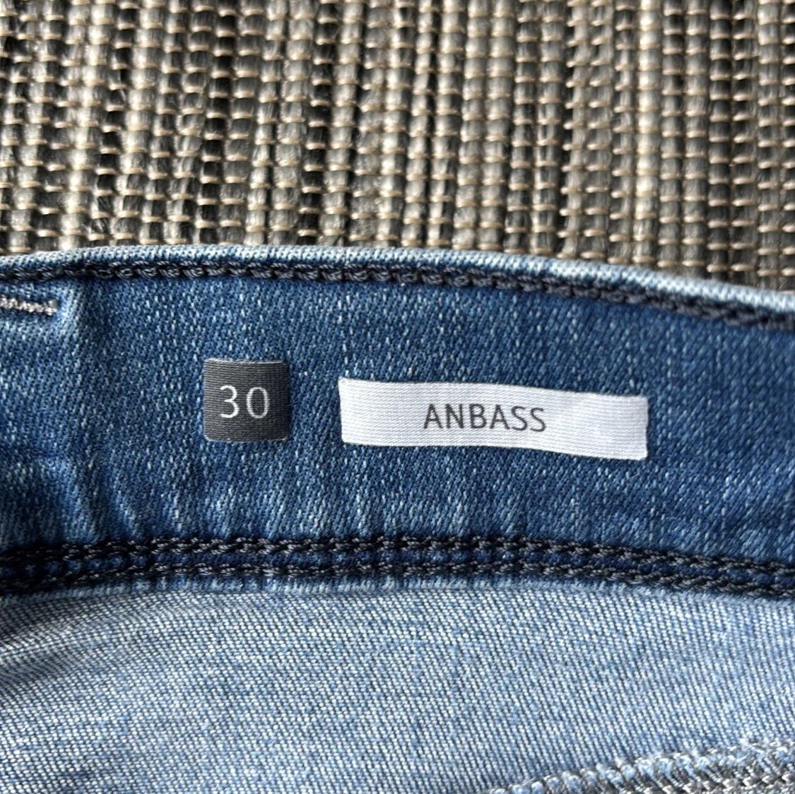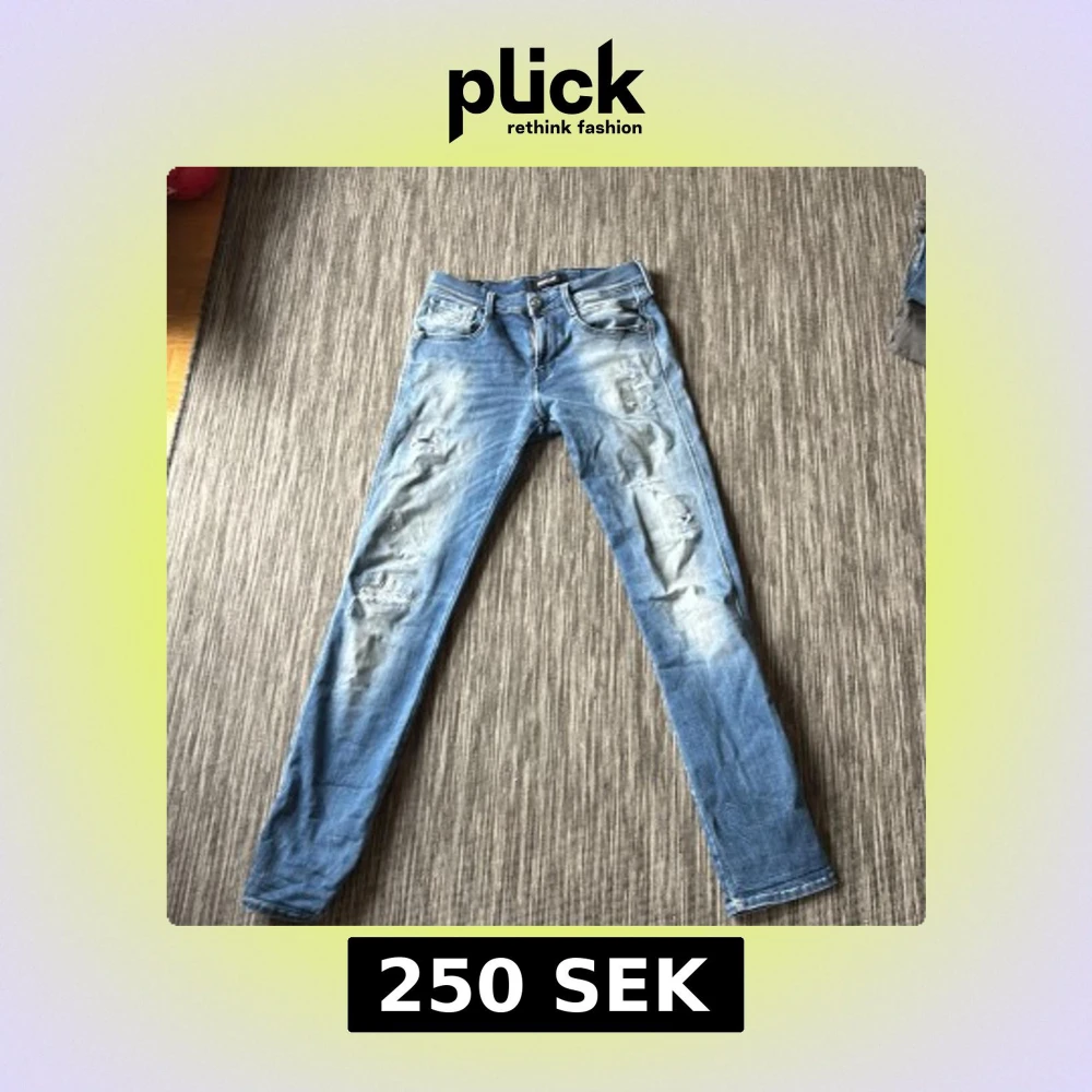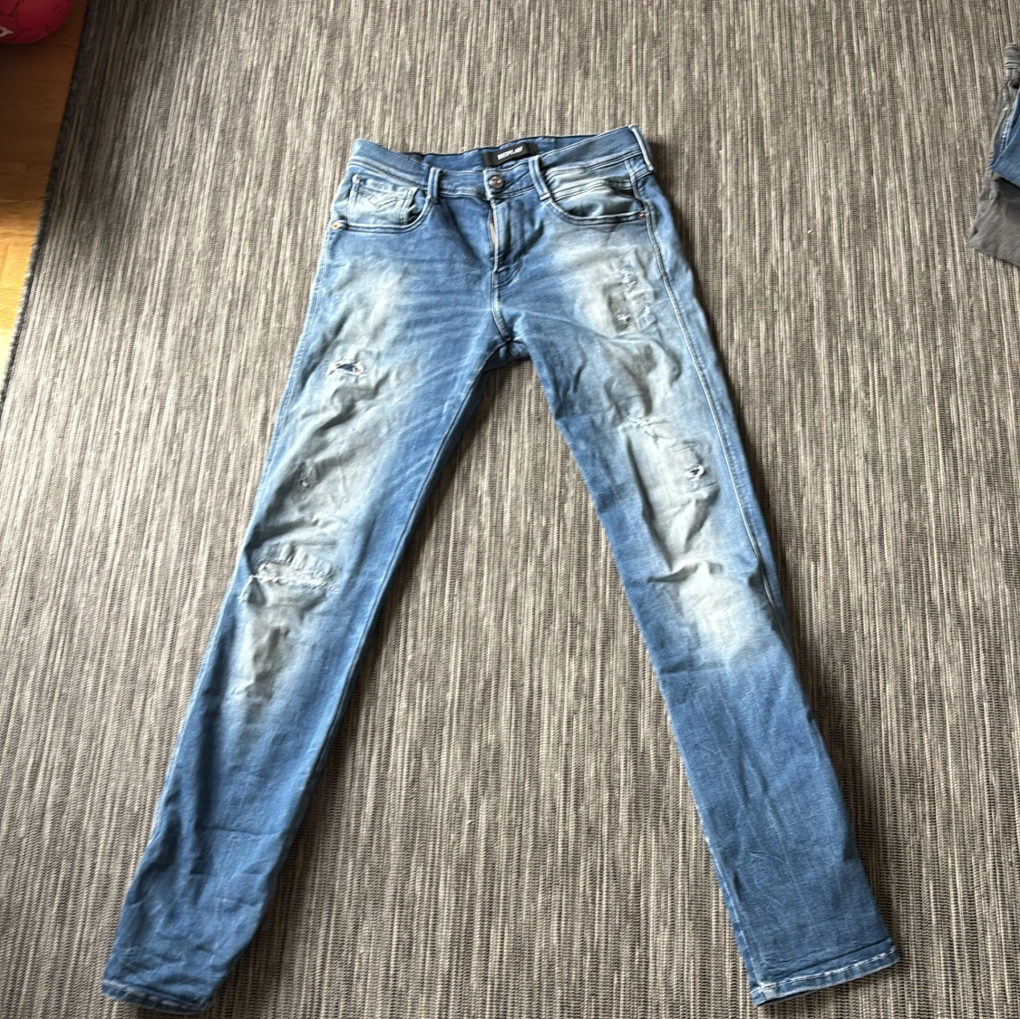 Säljer ett par Replay Anbass Hyperflex jeans i blå tvätt med slitna detaljer och skinny passform. Byxorna har klassisk femficksdesign, knappgylf och stretchigt material som ger extra komfort. Perfekt för dig som gillar en smal siluett och coola slitningar.