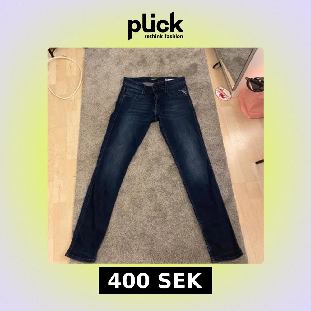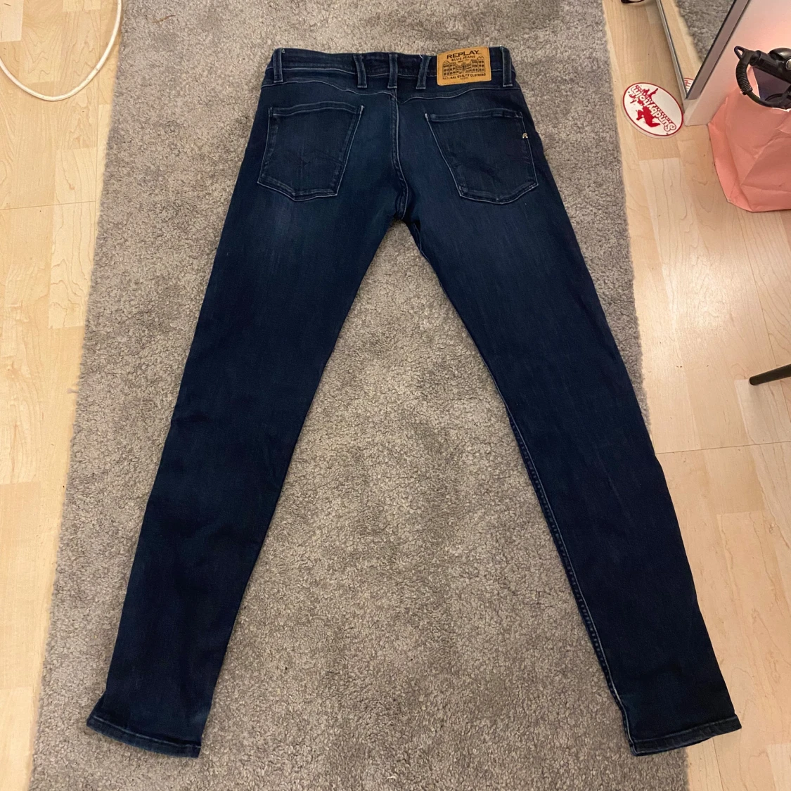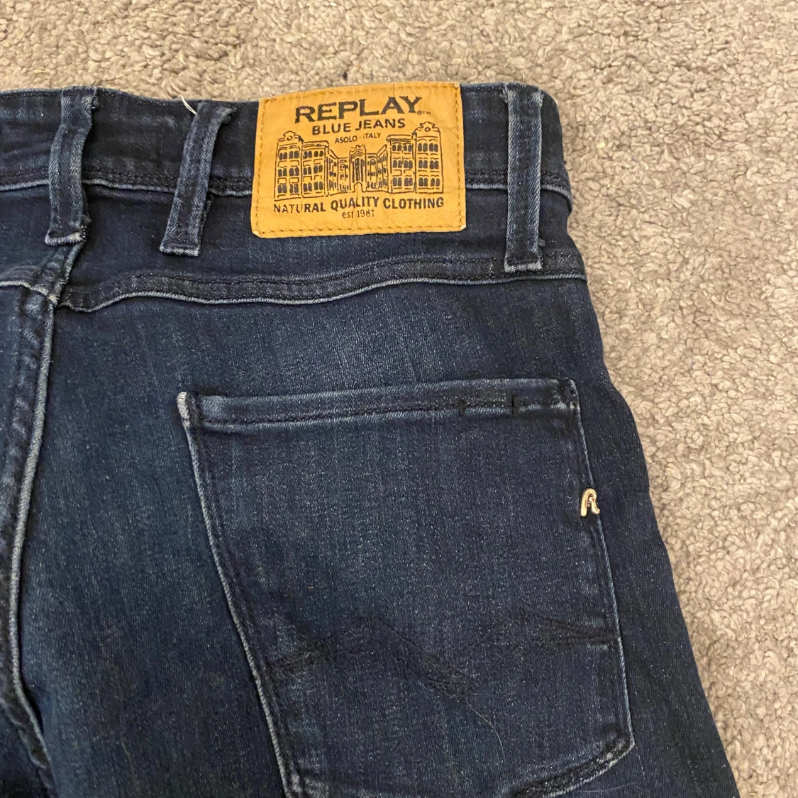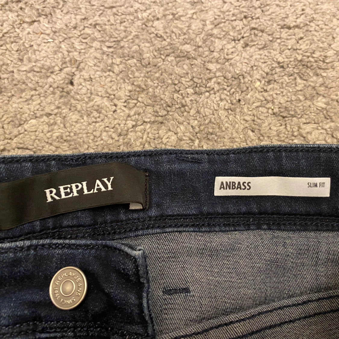 Snygga mörkblå Replay Anbass jeans i slim fit-modell. Klassisk femficksdesign, läderpatch bak och diskreta slitningar framtill. Replay-detaljer på fickorna.