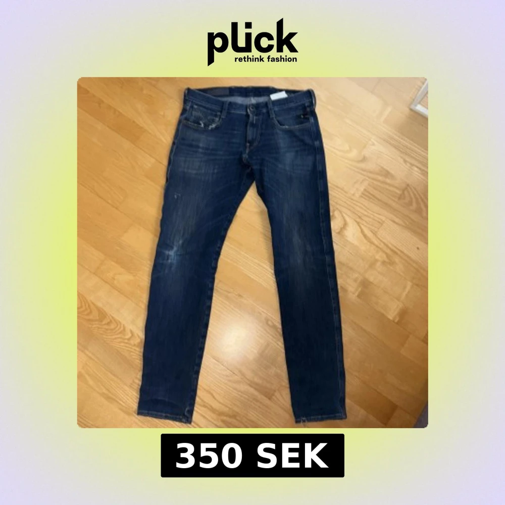 Säljer ett par Replay Anbass jeans i mörkblå tvätt med snygga slitningar. Modellen har smal passform och klassisk femficksdesign. Jeansen är tillverkade i stretchig denim för extra komfort och har diskreta kontrastsömmar.