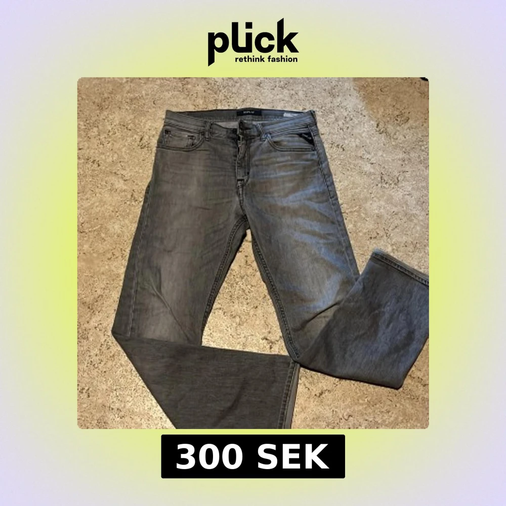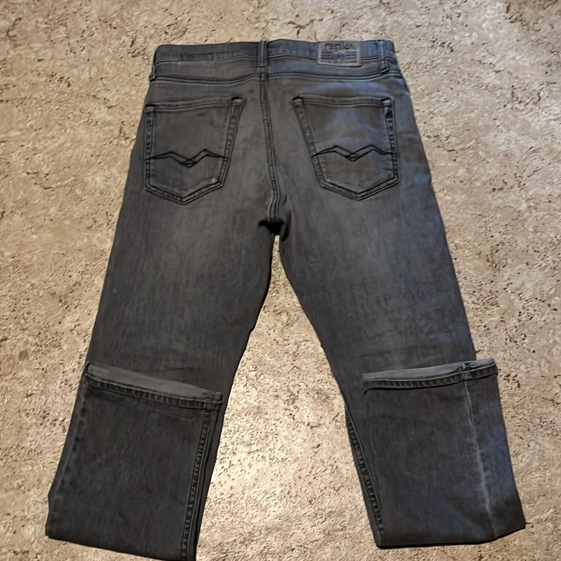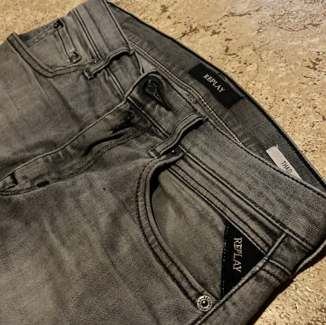 Snygga grå jeans från Replay med klassisk femficksdesign och raka ben. Jeansen har diskreta slitningar och svarta detaljer vid fickorna. Perfekta för dig som gillar en stilren look med lite edge. Materialet är mjukt och följsamt jeans.