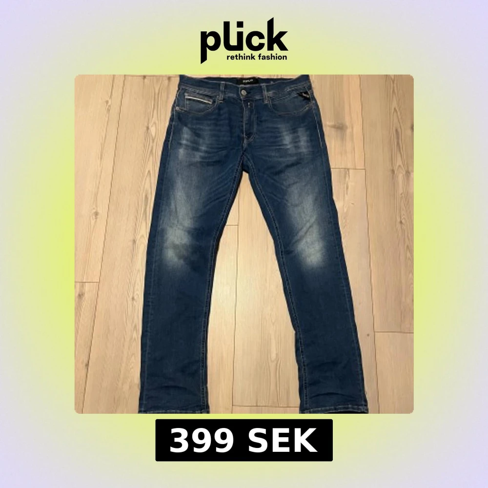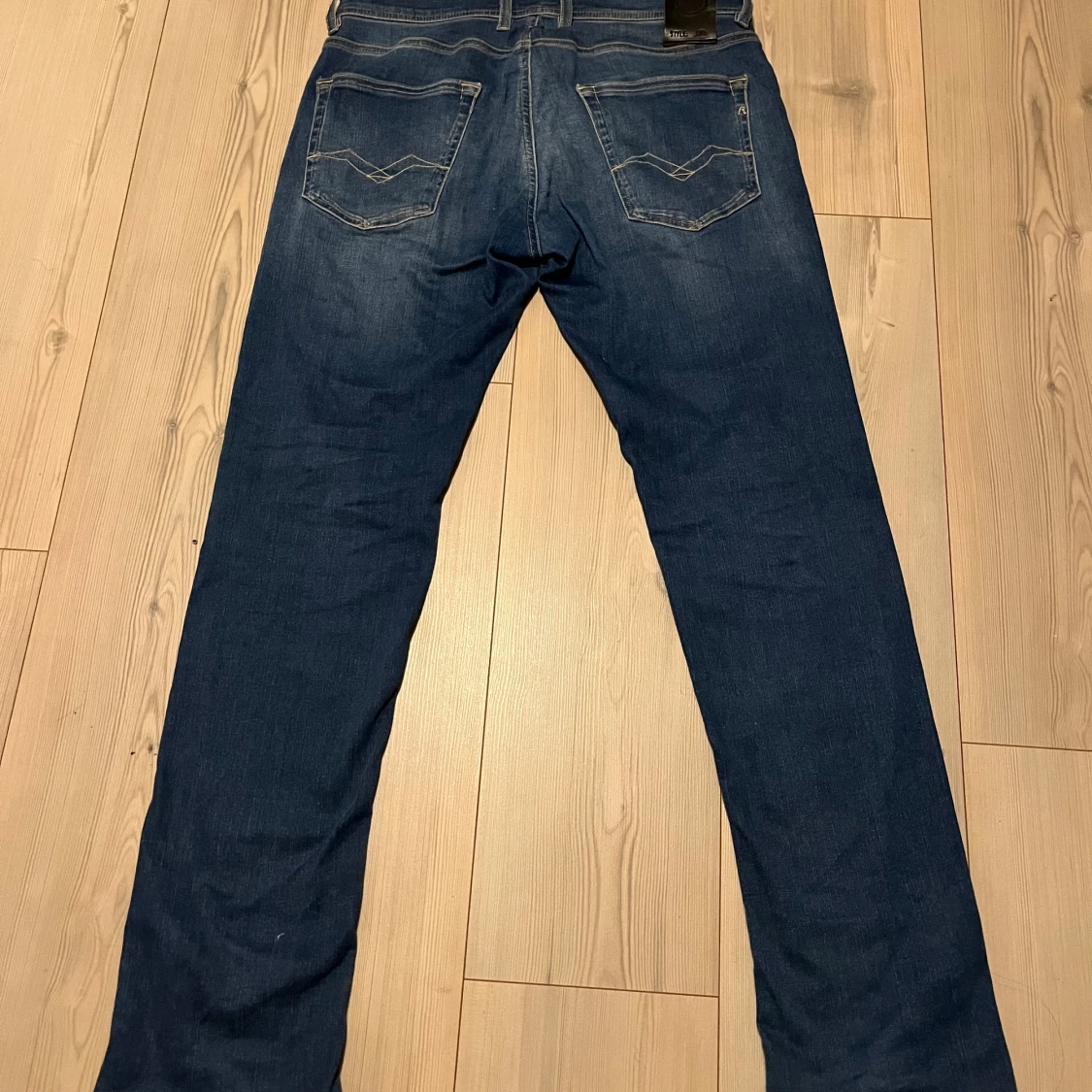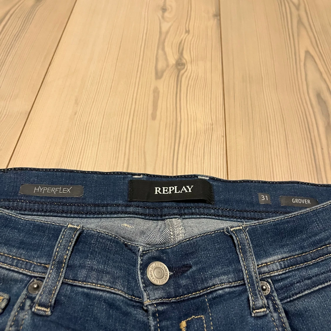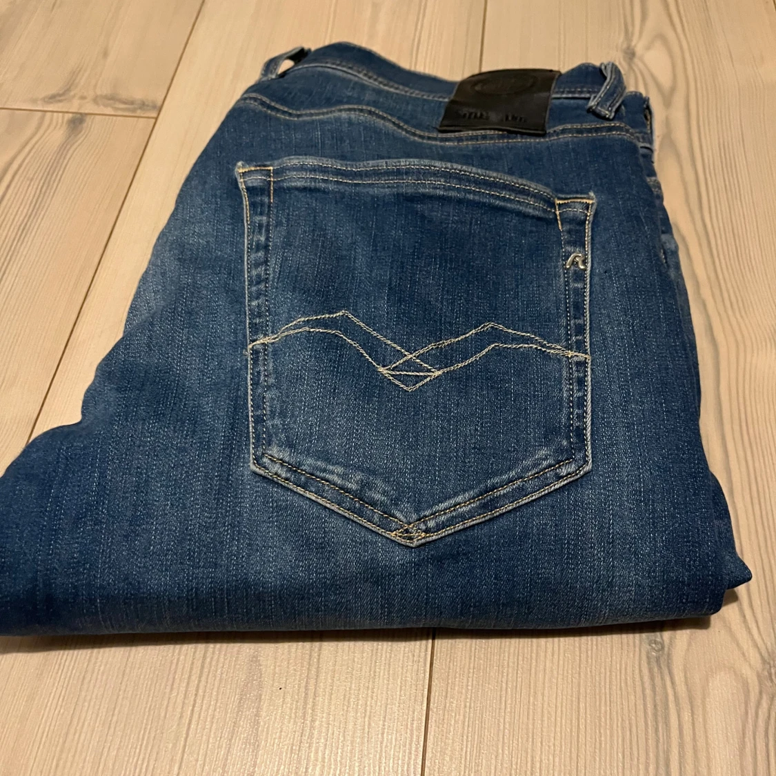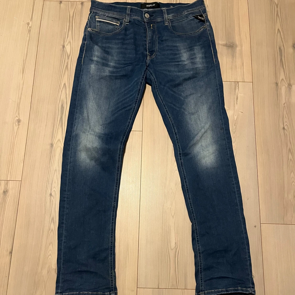 Snygga Replay Grover Hyperflex jeans i klassisk blå tvätt med lätt slitna detaljer och raka ben. Jeansen har normal passform, fem fickor och coola sömmar på bakfickorna. Perfekt stretch tack vare Hyperflex-materialet för extra komfort storleken är 31/32. Dessa är använda bara några få gånger så inga skador. Hör av er vid frågor.