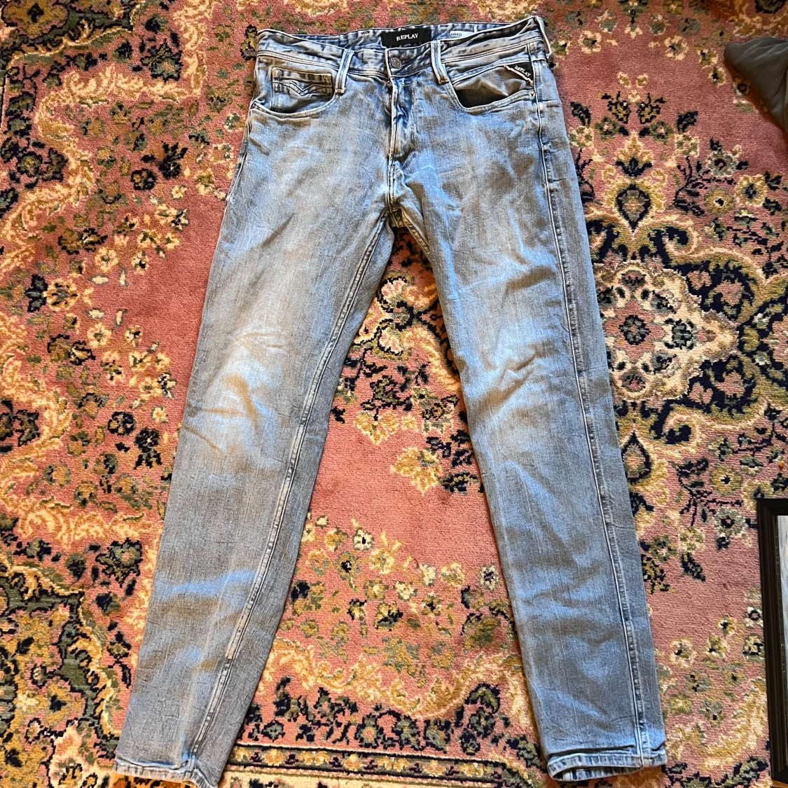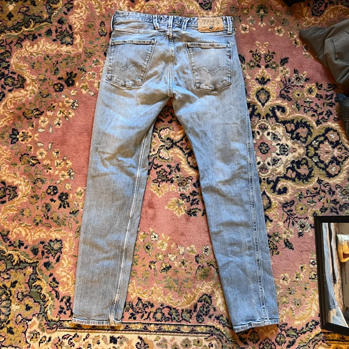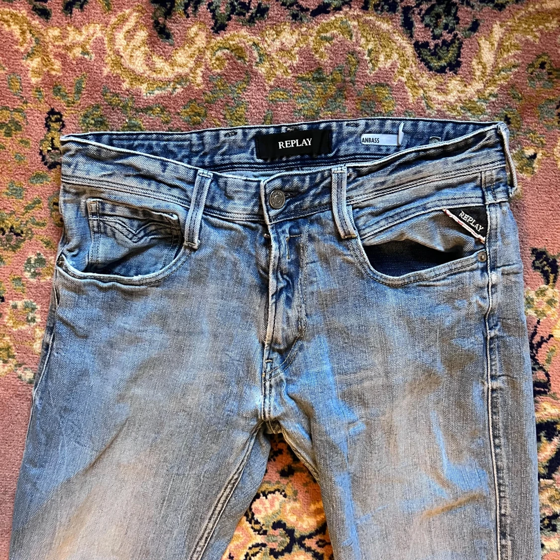 Säljer ett par Replay Anbass jeans i ljusblå tvätt med klassisk femficksdesign och smal passform. Jeansen har snygga slitningar och detaljer vid fickorna, samt knapp och dragkedja i gylfen. Perfekt för dig som gillar en modern och stilren look. (30) midja 39cm längd 99cm