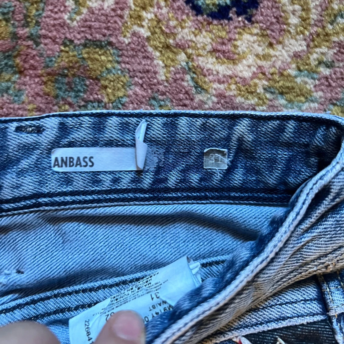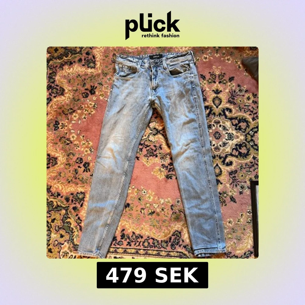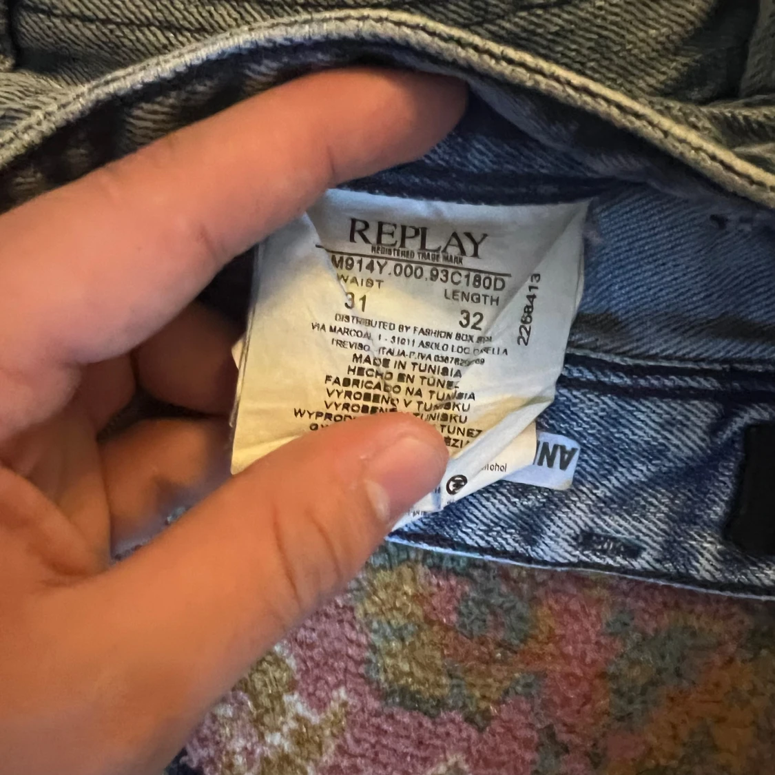 Säljer ett par Replay Anbass jeans i ljusblå tvätt med klassisk femficksdesign och smal passform. Jeansen har snygga slitningar och detaljer vid fickorna, samt knapp och dragkedja i gylfen. Perfekt för dig som gillar en modern och stilren look. (30) midja 39cm längd 99cm