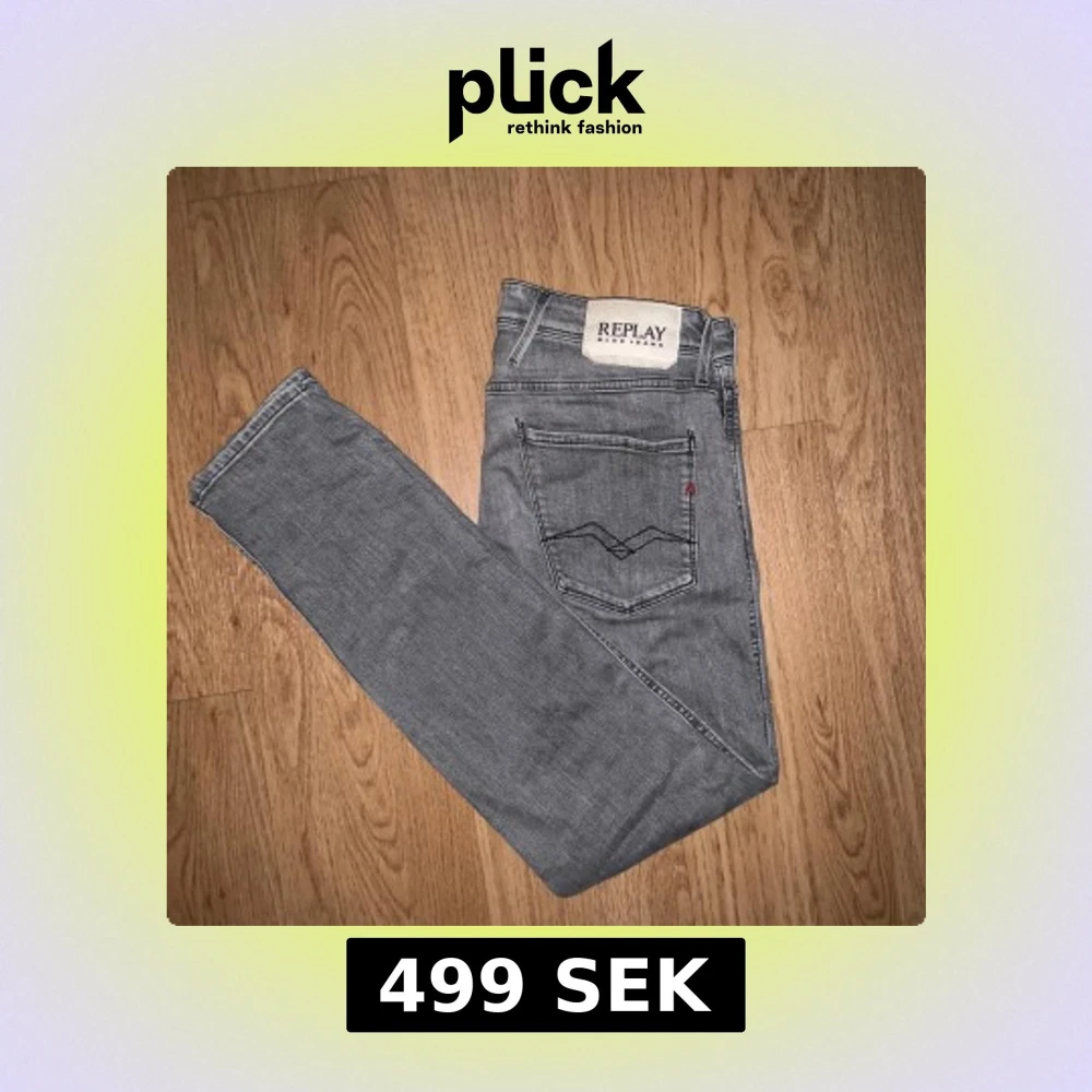 Snygga grå jeans från Replay, modell Anbass med slim fit. Klassisk femficksdesign, svarta detaljer och diskret Replay-logga på fickan. Jeansen har en modern, smal passform och är tillverkade i mjukt denimtyg som sitter skönt hela dagen. Bra skick men lagade mellan benen
