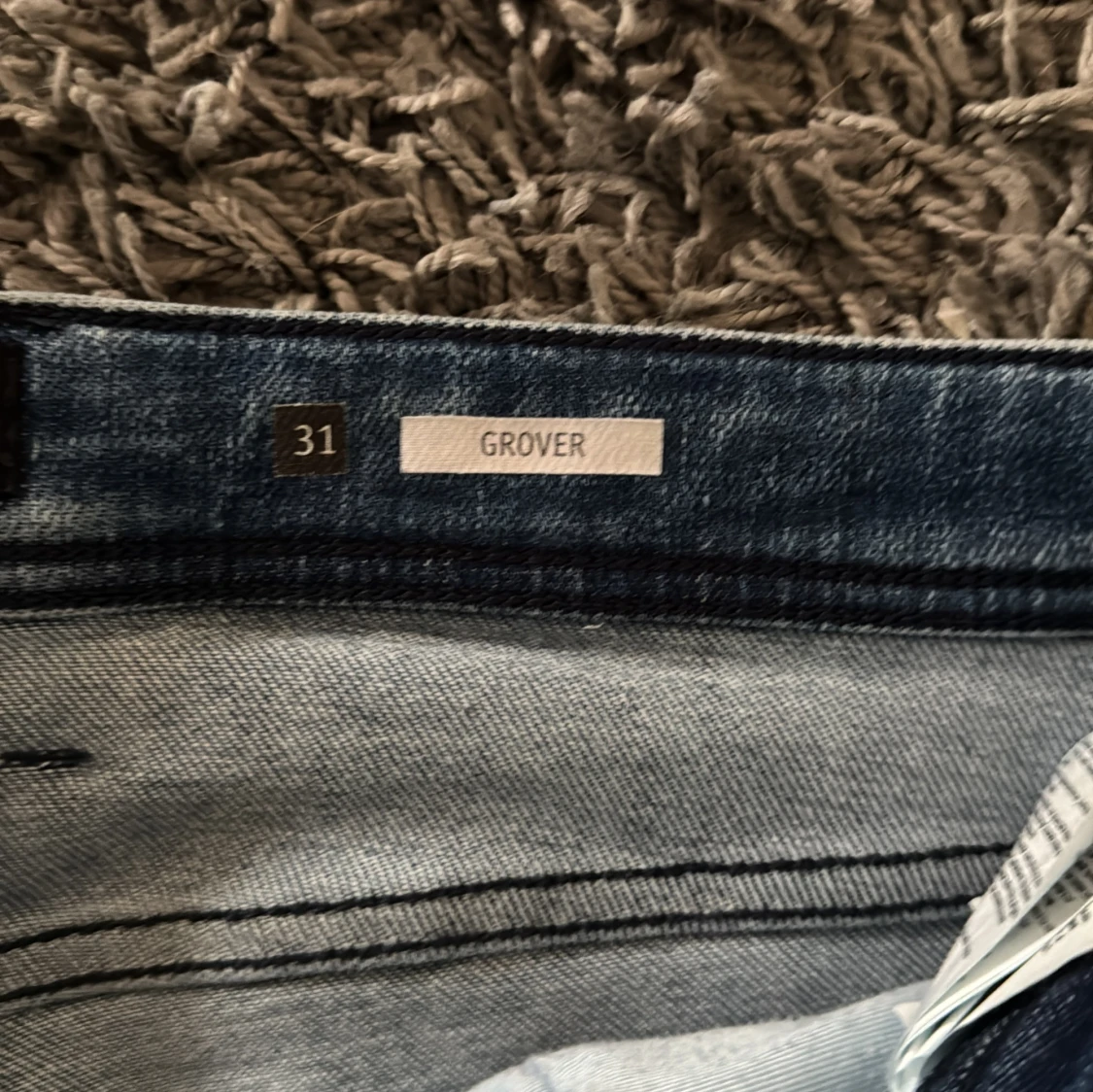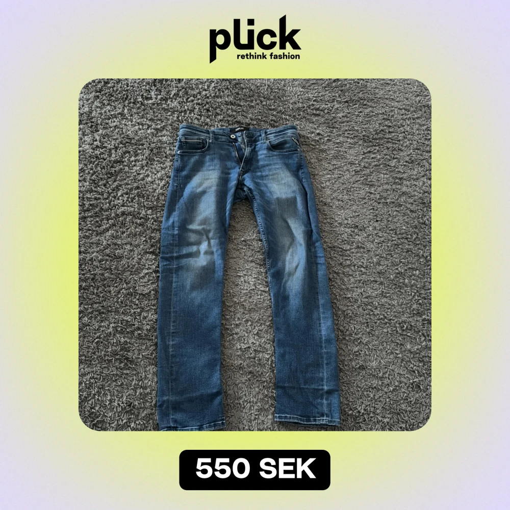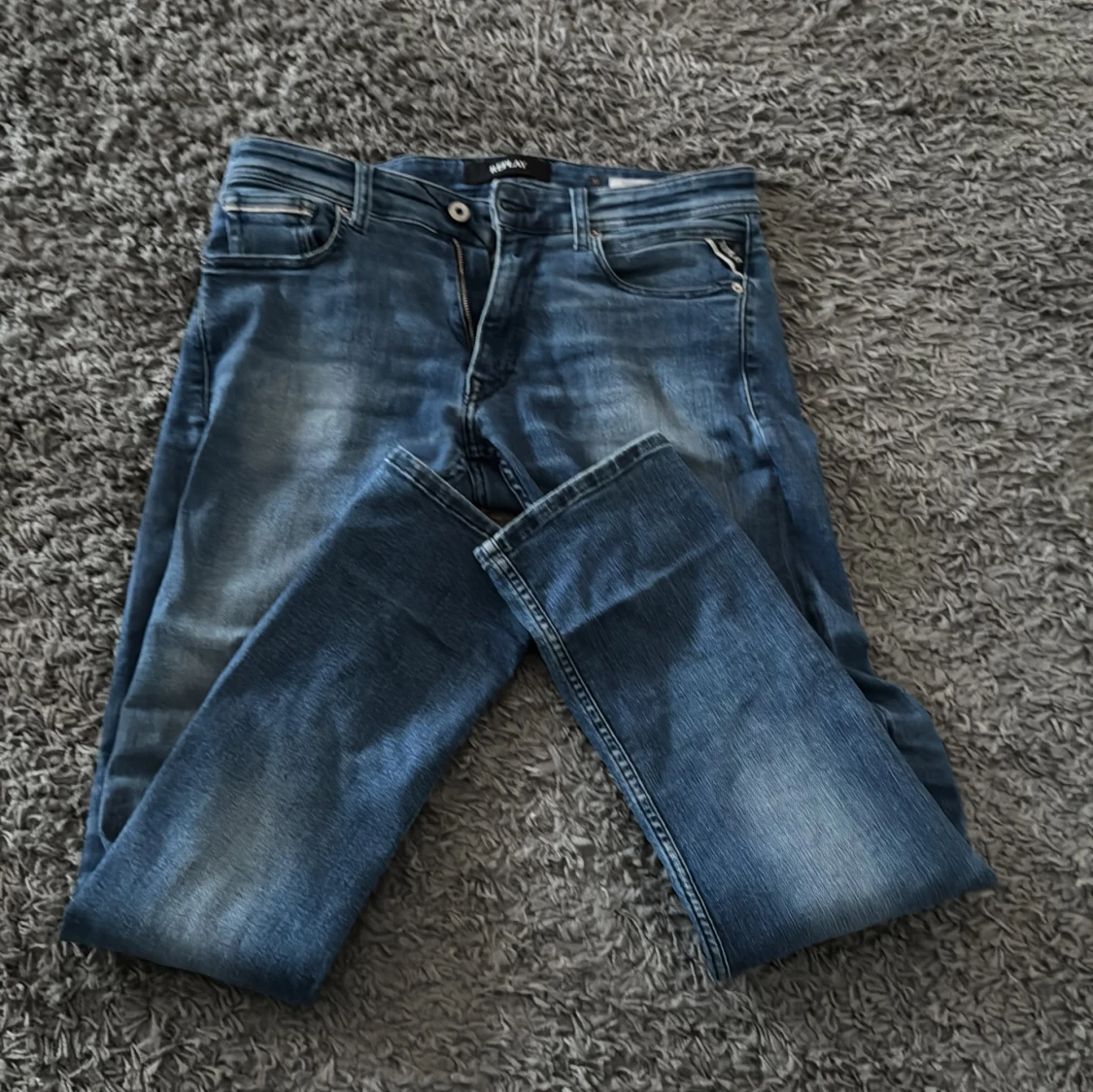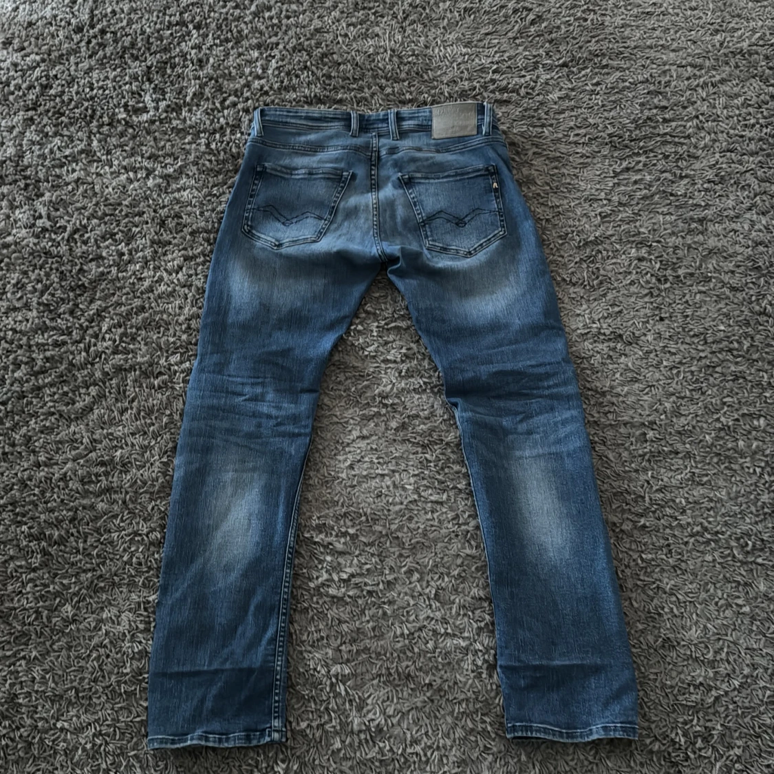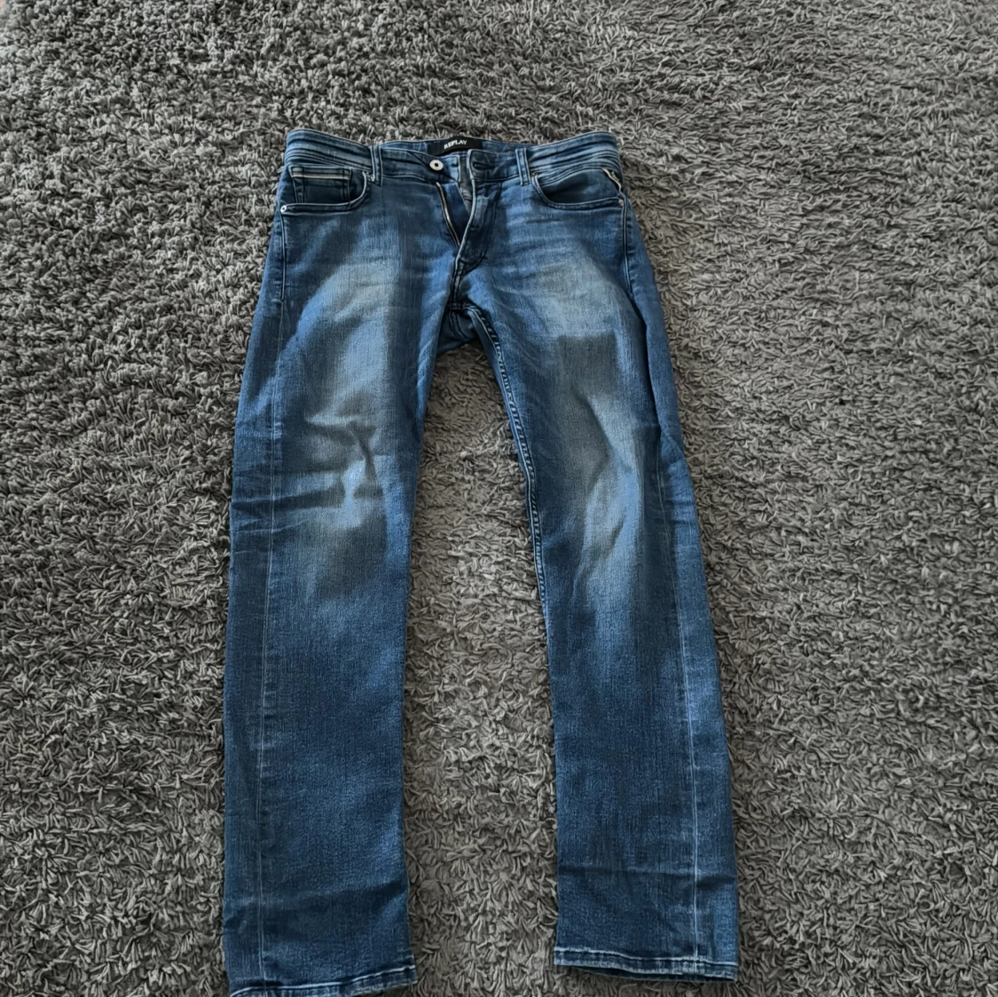 Säljer ett par snygga blå jeans från Replay i modellen Grover. De har en klassisk straight fit och är i bra skick skulle säga 9/10 och dem är använda 5-10 gånger.