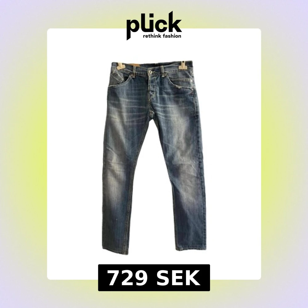 Snygga dondup jeans i klassisk blå tvätt med slitningar och kontrastsömmar. Modellen har smala ben, fem fickor och låg midja. Jeansen är gjorda i mjukt denim och har detaljer som metallknappar och logotyp på bakfickan. Mycket bra skick