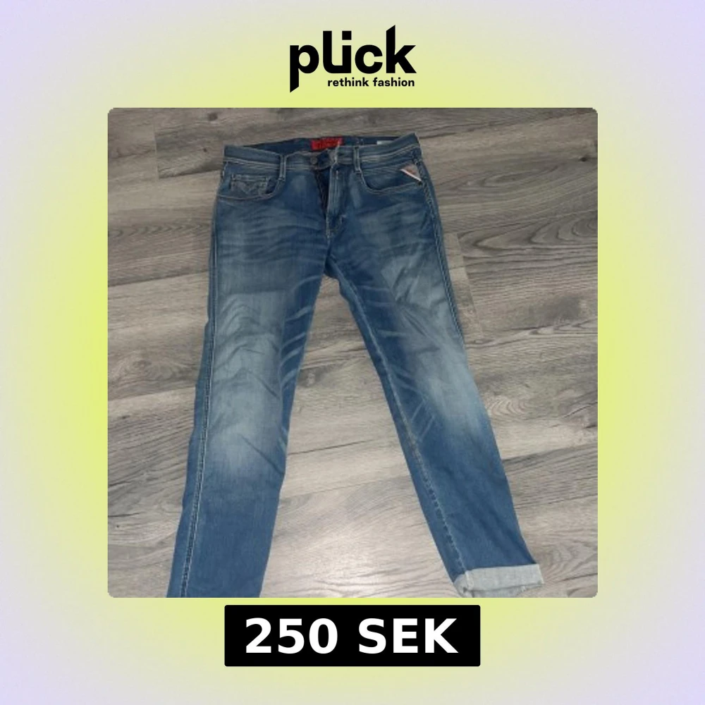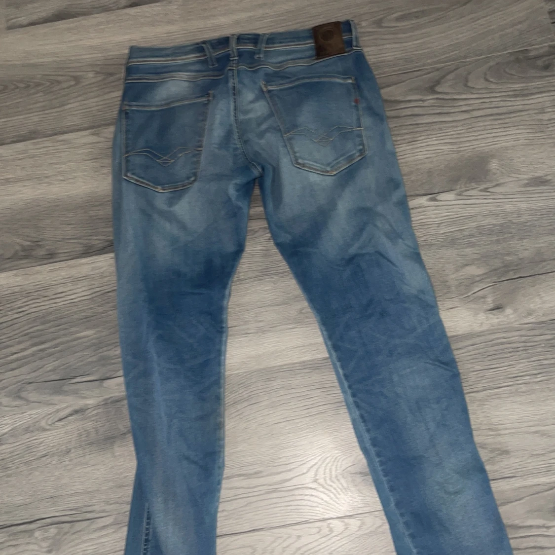 Säljer ett par blå jeans från Replay med snyggt tvättad effekt och klassiska fem fickor. Jeansen har normal passform och raka ben, med detaljer som synliga sömmar och Replay-logga på bakfickan. Perfekta för en avslappnad stil.
