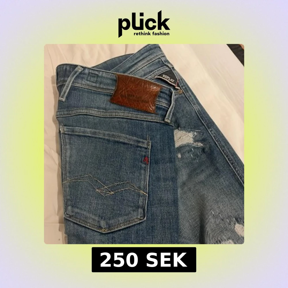 Snygga blå jeans från Replay med en klassisk femficksdesign och en sliten look. De har en läderpatch med Replay-logga på baksidan och en liten röd detalj vid fickan. Perfekta för en avslappnad stil.