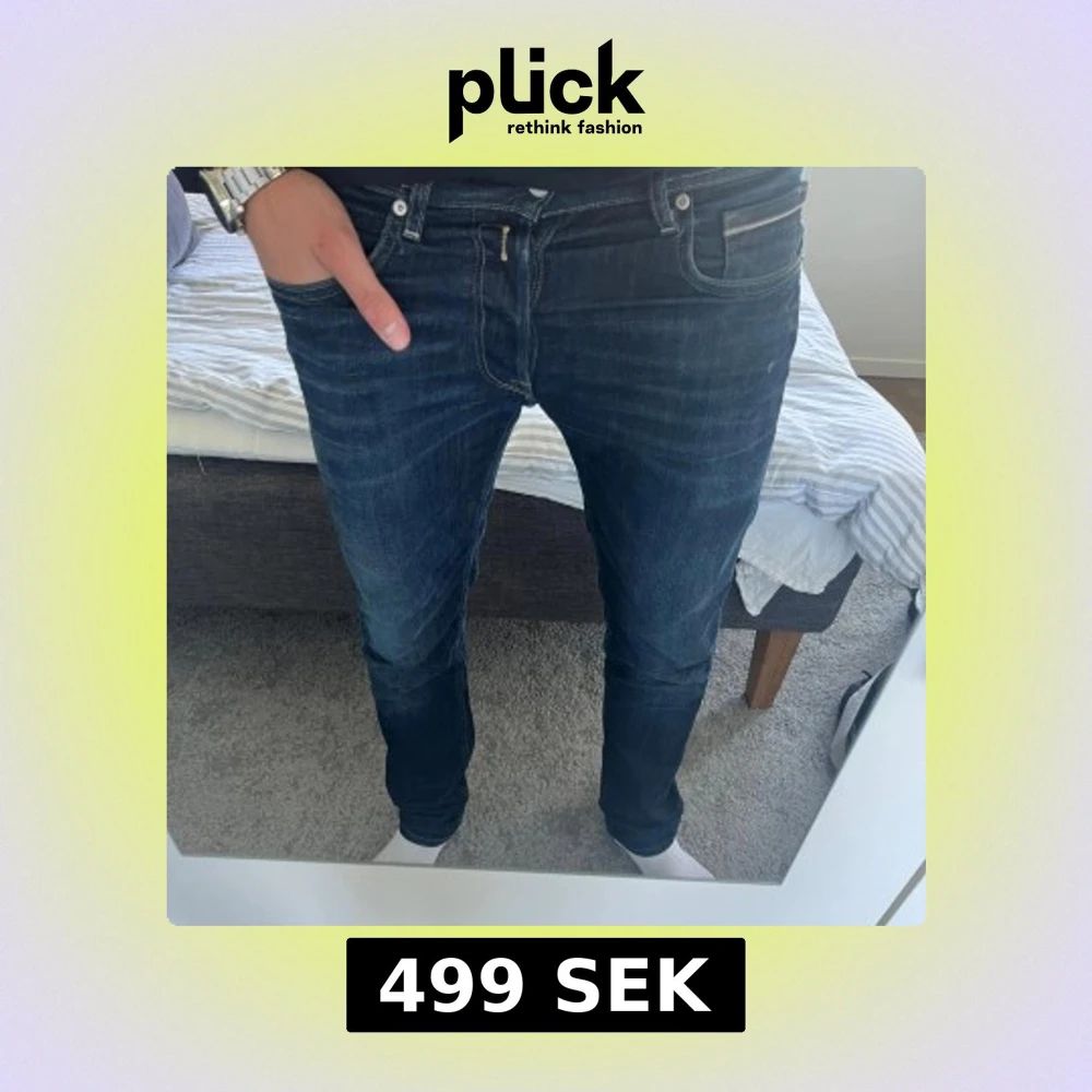 Säljer ett par Replay Grover jeans i mörkblå tvätt med snygga slitningar och kontrastsömmar. Jeansen har använt en del pga av bra kvalité o väldigt snygga. Storlek 32/34(sitter som de). Säljer för att de lite tajta i midjan. Kan gå ner i pris vid snabb affär😃Hör av dig vid frågor o funderingar😃